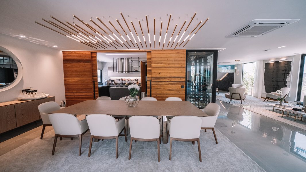 A ampla área social com adega climatizada proporciona aos frequentadores um vislumbre do estilo de vida luxuoso que a residência pode oferecer.