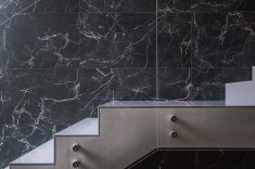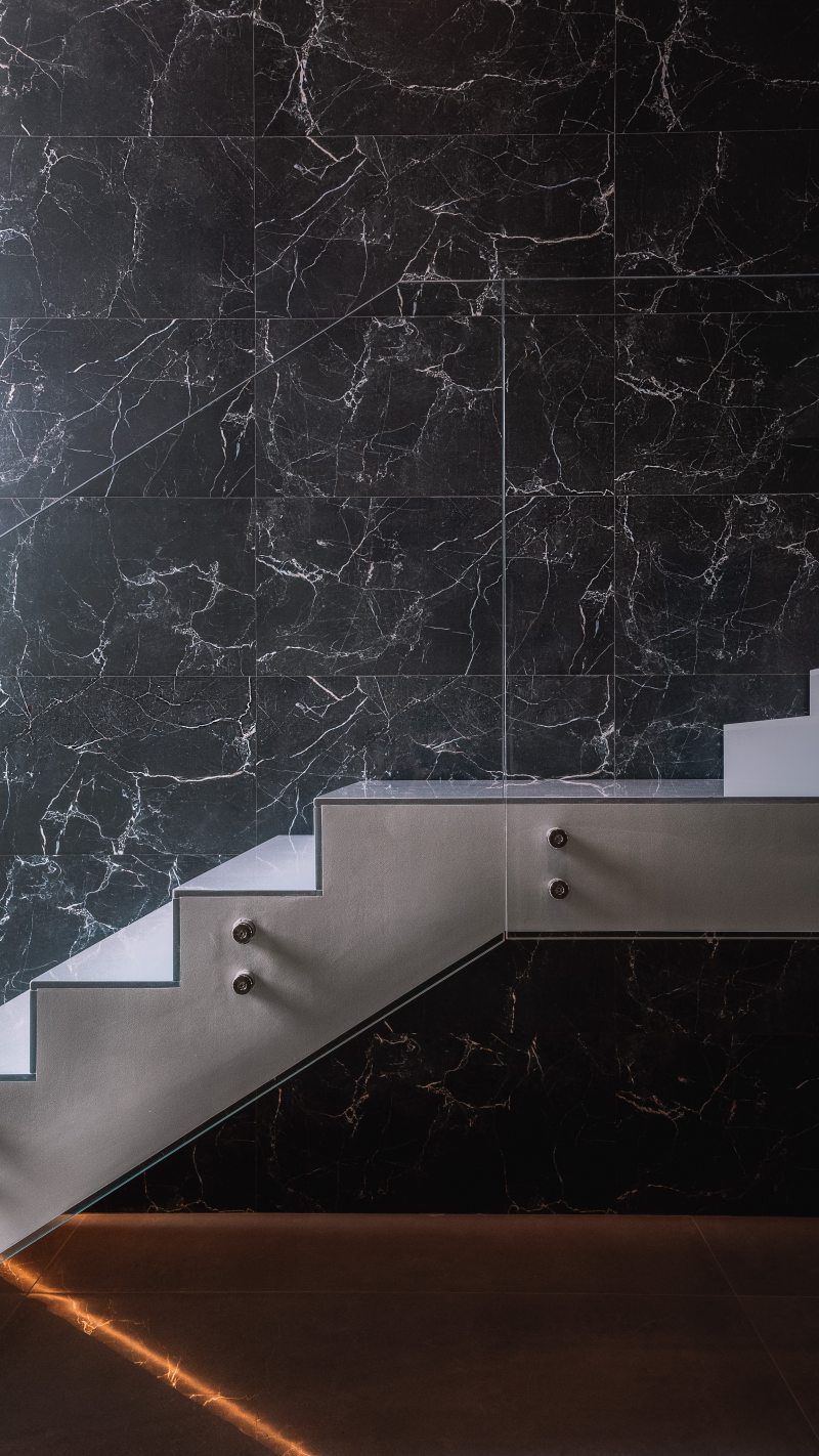 Sinônimo de alta qualidade, os revestimentos da Roca Cerámicas foram a escolha natural para o empreendimento: logo na entrada, a escada em porcelanato Full Concret grande formato valoriza o aspecto imponente da lateral em porcelanato Venatino Black.