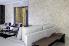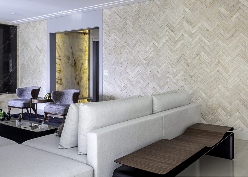 Acima: No living, a arquiteta Cristiane Schiavoni usou os bricks de cerâmica numa paginação de espinha de peixe para decorar o living integrado | Fotos: Carlos Piratininga