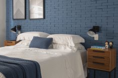 Acima: Na arquitetura de interiores assinada pela arquiteta Marina Carvalho o azul coloriu a parede de tijolinhos | Foto: Evelyn Müller