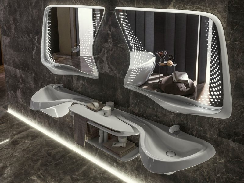 Além disso, um ambiente de banho completo com os produtos da Systempool, que comercializa cubas, banheiras e acessórios em KRION®, um material composto por 2/3 de minerais naturais e uma baixa porcentagem de resinas de grande resistência. Outro ambiente que terá destaque especial é a linha Vitae, da Noken. A linha é assinada pela arquiteta iraquiana-britânica mundialmente reconhecida, vencedora de diversas competições internacionais, Zaha Hadid