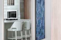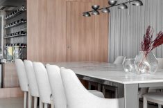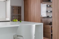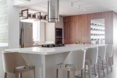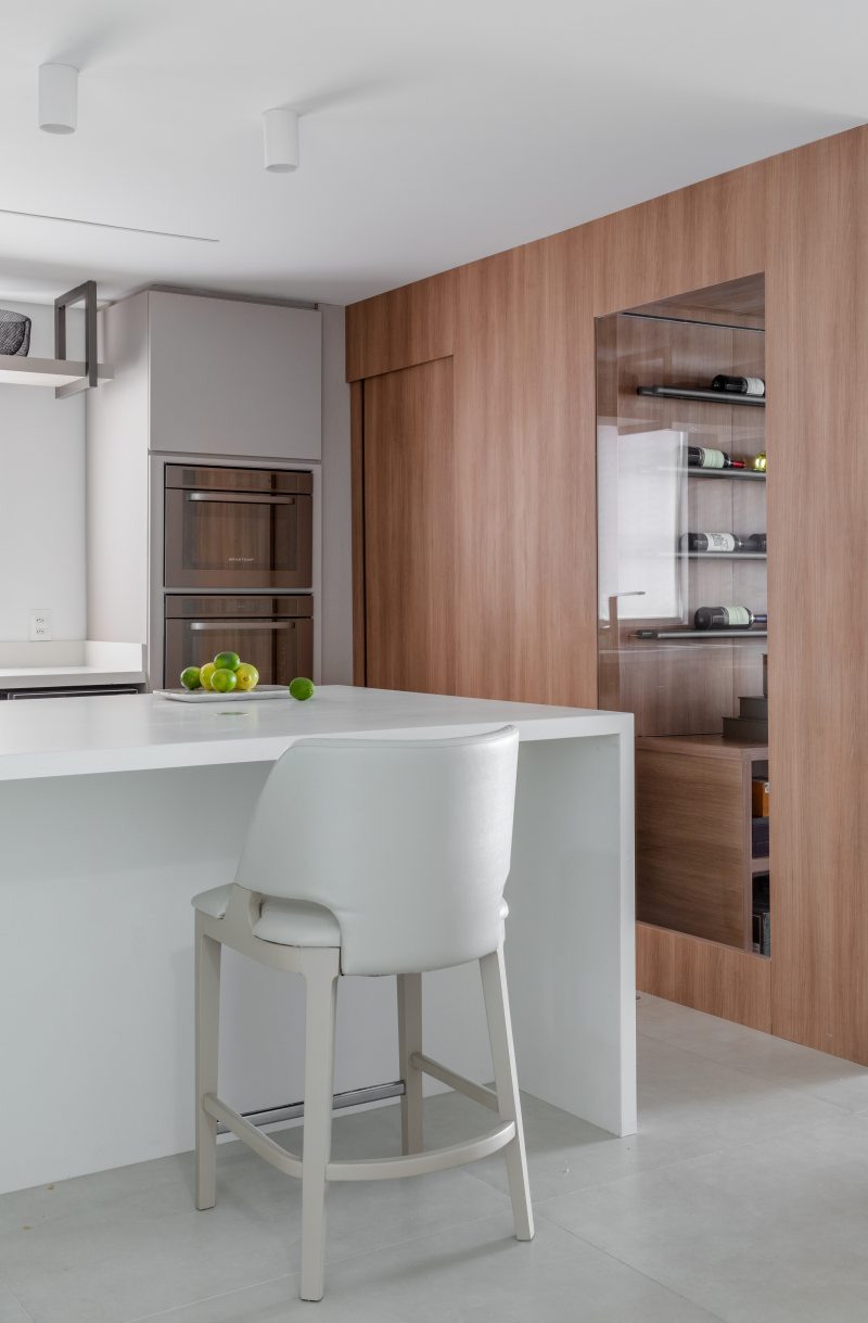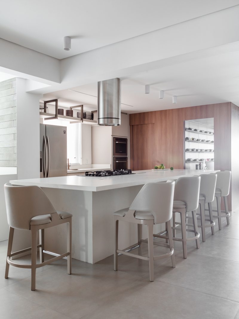 Ao lado, a imponente cozinha integrada, com uma ilha central de 3,60m em mármore Atlas Plan Branco e banquetas Cotti, da Villa Batel, foi pensada para agregar praticidade ao dia a dia da família e preservar a possibilidade de interação com os convidados até durante o preparo dos alimentos.