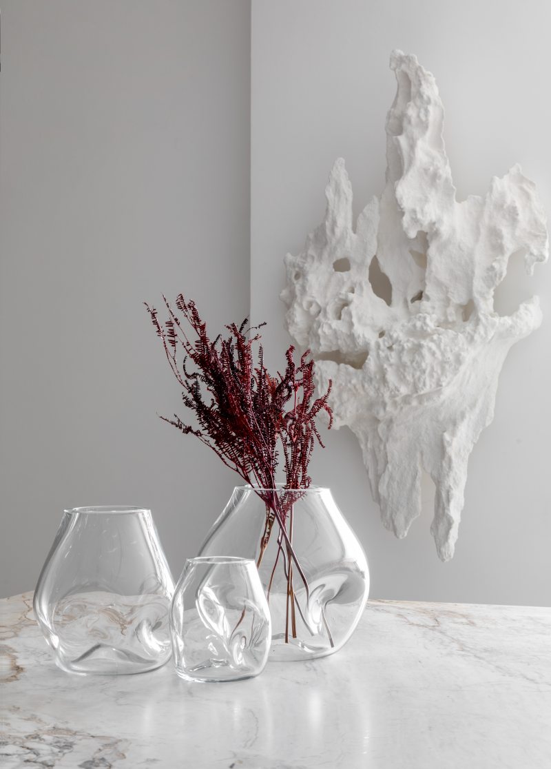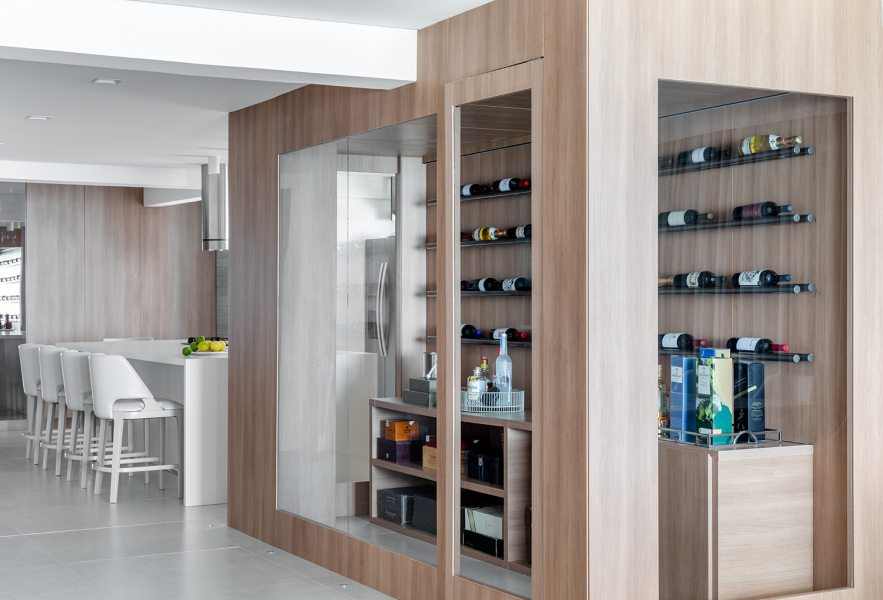 As paredes foram demolidas e os ambientes distribuídos ao redor de uma adega de vinhos sob medida, construída em madeira clara e divisórias corrediças de vidro. Central para o layout, a adega serve tanto para armazenar bebidas quanto para camuflar os acessos à lavanderia e ao lavabo social.