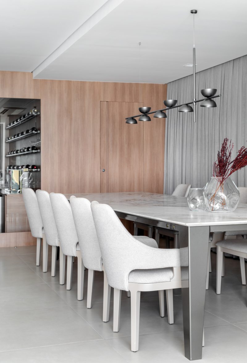 Essencial para o projeto, o mobiliário Villa Batel foi escolhido pelas profissionais para adicionar coesão ao décor e proporcionar maior conforto aos moradores e convidados. A sala de jantar, por exemplo, foi decorada com cadeiras Cotti da Villa Batel - mesma linha que as banquetas utilizadas na bancada da cozinha. Na varanda, por fim, as cadeiras Golf, de Ibanez Razzera para a Villa Batel, resultaram numa agradável área de convivência ao ar livre.