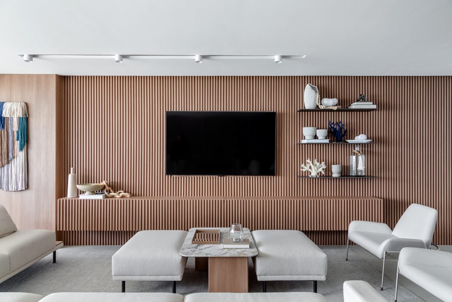Onde: Curitiba • 05 de Setembro - 2023 | Fotos Fábio Jr. SeveroO espaçoso apartamento de frente para o mar foi decorado com peças de grande porte e soluções que priorizam a convivência familiar
