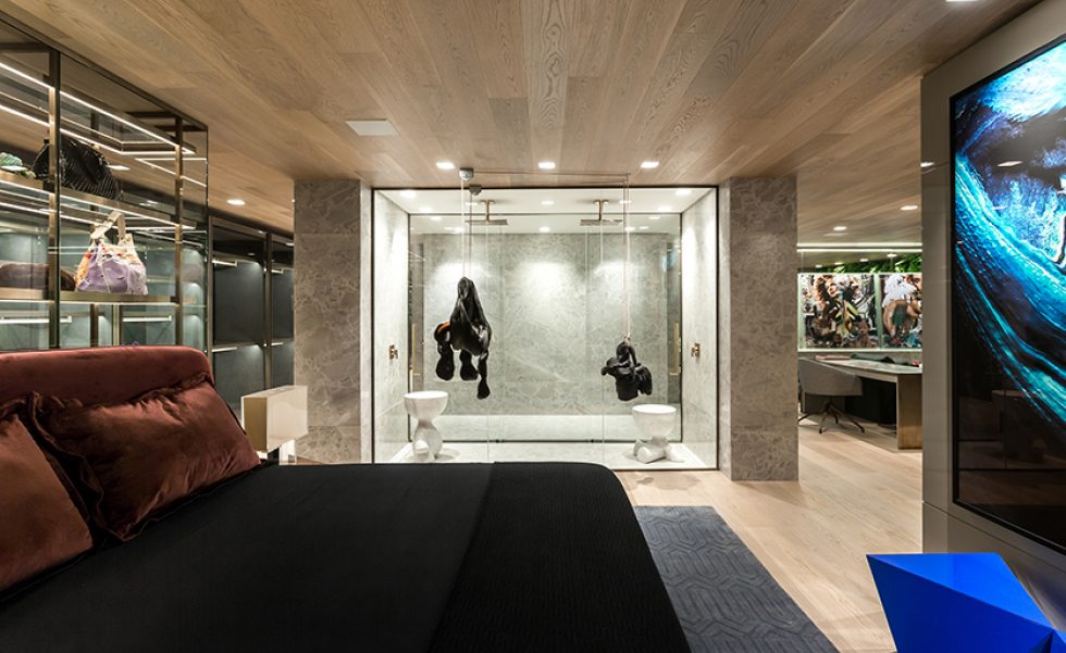 O arquiteto Jayme Bernardo mostra a Suíte do Casal, ambiente assinado por ele com o lindíssimo mármore Paraná Kronos, extraído de jazida própria da Gramarcal, com veios acinzentados únicos no Brasil:
