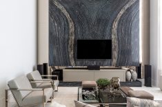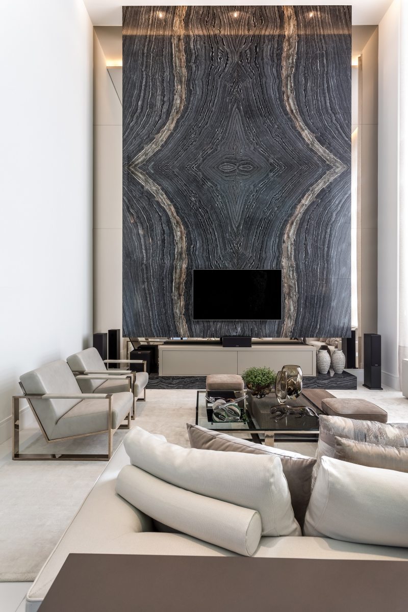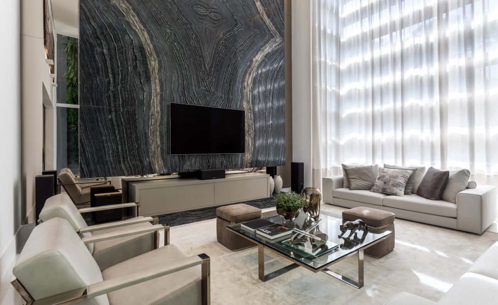 Mármore ganha protagonismo na sala de estar