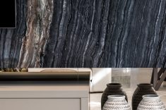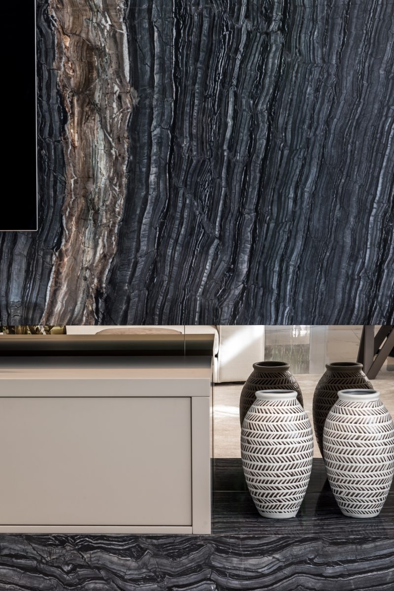 À primeira impressão, o olhar logo se volta ao impactante painel em mármore Nero Madera, da NPK Mármores. Com nuances de cores únicas, que vão do preto ao cinza e castanho, a pedra foi trabalhada em paginação livro aberto – quando há um encaixe perfeito dos veios, formando um desenho contínuo. Destaque em meio a uma paleta cromática mais neutra, o mármore foi escolha pessoal da cliente. “Mesmo tendendo a escolhas mais clean, foi paixão à primeira vista: a moradora amou a nobreza, força e expressividade que o material transpassa”, comenta a arquiteta Andrea Posonski.