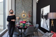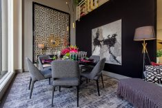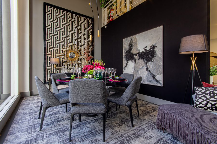 A designer de interiores Flávia Mattar apresenta a textura como principal característica do espaço. Como a profissional destacou a cor preta no ambiente, o que traz uma característica mais fria, ela aqueceu o décor com texturas e tecidos. O destaque vai para a tapeçaria na parede, que agrega mais personalidade ao espaço, junto à sarja e ao quadro da artista Marilene Ropelato.