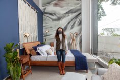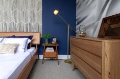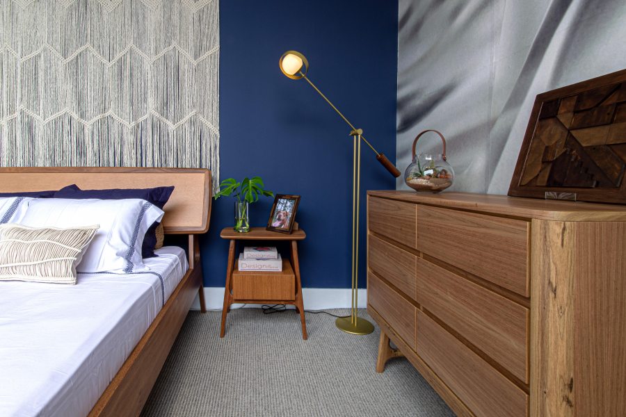 Quarto que é um verdadeiro refúgio, a arquiteta Simone Sidor, apresenta um espaço de conexão com o lar. Inspirada na natureza, a profissional destacou as fibras naturais, madeira e o azul no espaço. O papel de parede conta com uma arte aplicada exclusiva desenvolvida pela artista Raquel Lima. O macramê proporciona uma atmosfera de acolhimento e conexão com o trabalho manual. Além disso, todos os móveis em madeira Massoti, apresentam os elementos naturais do quarto, junto as plantas naturais.