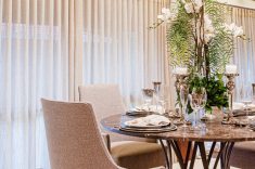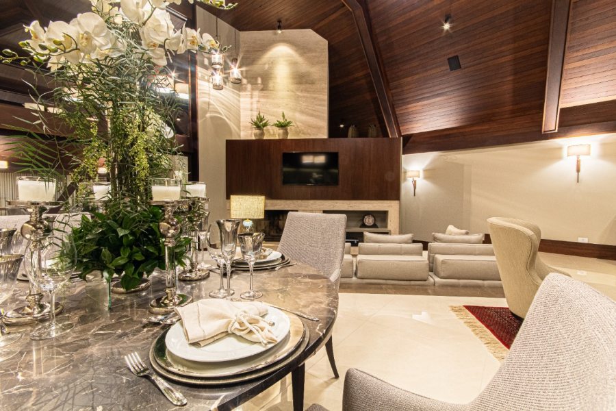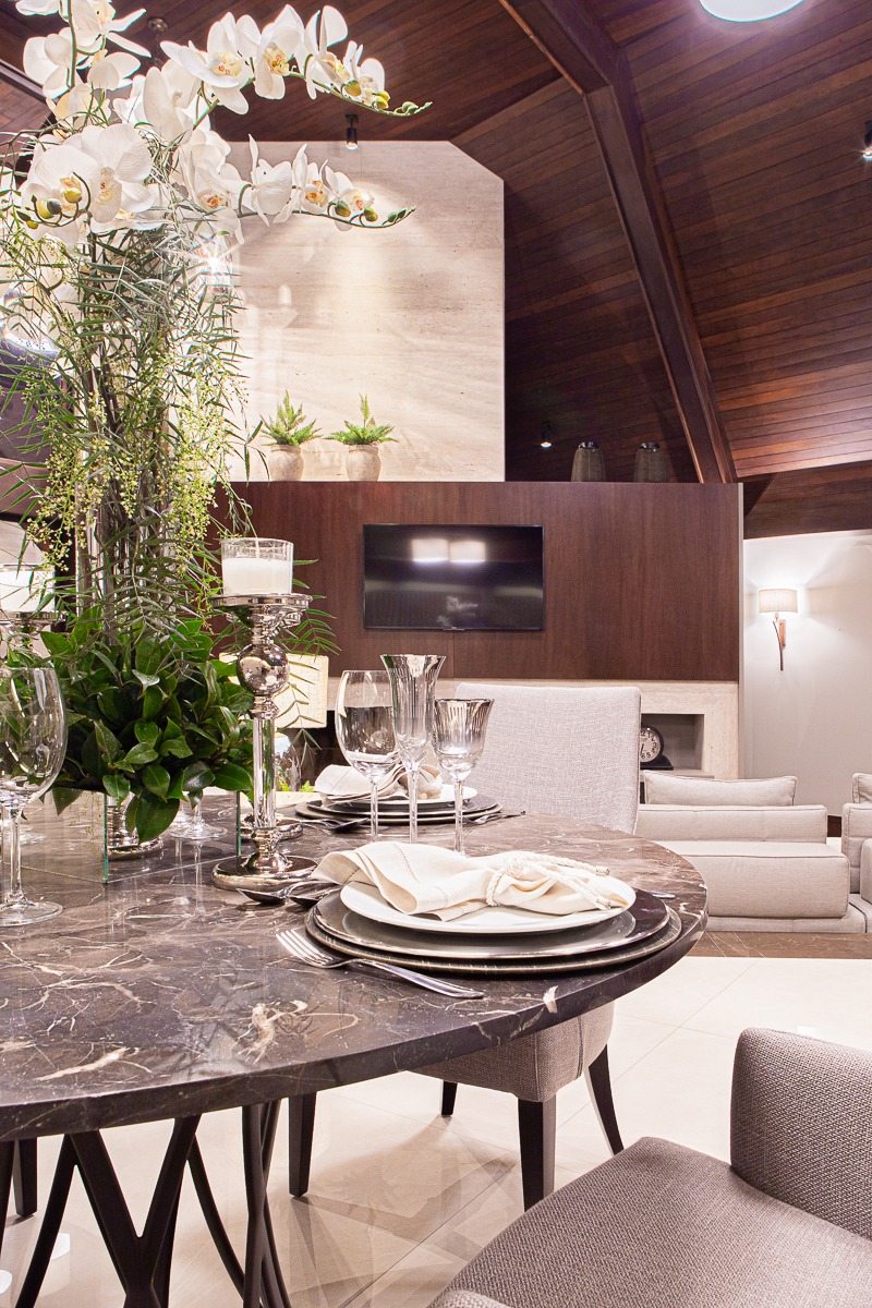 Com as louças, talheres e taças a postos, agora é hora de pensar no arranjo central que vai arrematar a produção. Não é algo obrigatório, mas, se você tiver espaço e quiser deixar a mesa mais elegante, este elemento vai ajudar bastante a deixar a produção mais sofisticada.
