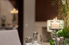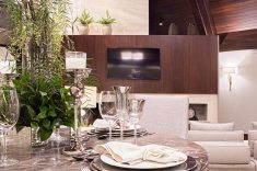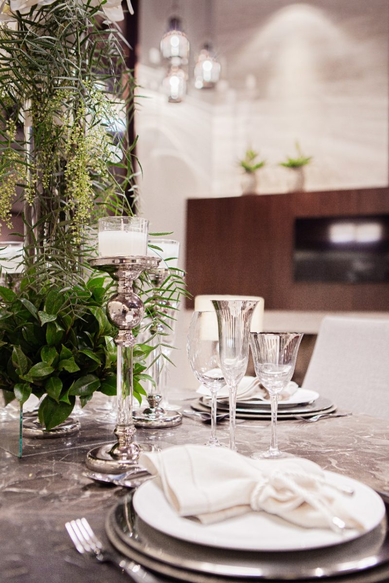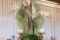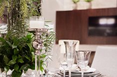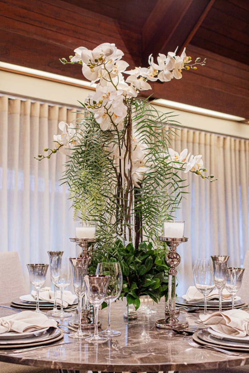 Verifique quanto espaço sobrou no centro da sua mesa e escolha, um vaso, cerâmica, cesto ou outra peça que possa receber um “verde“ natural. Se você tiver jardim em casa, aproveite o que tiver à disposição: pequenas plantas, que muitas vezes temos em casa, mudam completamente o efeito no ambiente quando colocadas numa peça central. Camélias, Ficus, Alecrim, Fórmio, Azaléia, Palmeiras, Samambaias... são vários exemplos. Aqui, optamos por usar a peça de vidro incolor decorada com ramos de Camélia na base. Aspargos e alecrim, num tubinho mais alto,arrematam o resultado final e combinam com os ramos de orquídeas brancas. O Arranjo alto deixa a mesa elegante e sofisticada. Se for celebrar à noite a sugestão é colocar velas: seja em castiçais ou até direto no tampo da mesa, o efeito das velas acesas deixa qualquer montagem mais aconchegante.