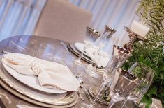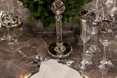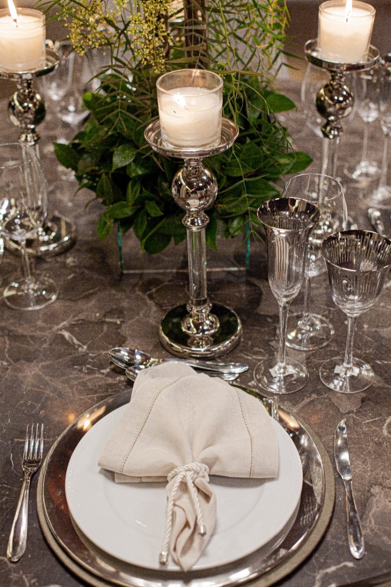 Por fim, as taças: a dica é deixá-las por último, pois elas é que irão harmonizar a mesa toda com o arranjo central (se houver) e serão posicionadas após a disposição dos pratos e talheres. Aqui, optamos por 3 taças: espumante, vinho e água. Os diferentes formatos e tamanhos ajudam a finalizar a composição - especialmente as taças de espumante e água com um acabamento de pintura em prata. Taças coloridas também são um ótima opção para personalizar a mesa, vale soltar a imaginação e pensar em novas possibilidades.