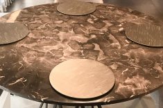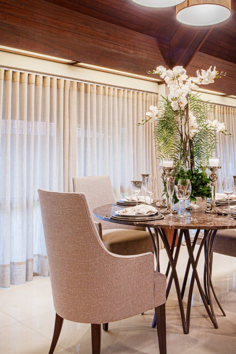 Desapegue das toalhas e parta para uma arrumação com jogo americano ou sousplat: a mesa fica mais leve, elegante e até mais fácil de arrumar. Nesse caso, devido ao formato redondo da mesa, usamos jogos americanos redondos (ou mesmo sousplat redondos) para harmonizar. Sobre o sousplat de tecido colocamos outro de inox: esse “prato de baixo”, de tecido, pode facilmente ser feito em casa cortando um papelão duro ou mdf em formato circular e criando uma “capa” com o tecido da sua preferência. O formato redondo ajuda a manter a mesa organizada e formata ainda melhor o desenho circular do mobiliario.