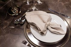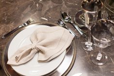 Você não precisa usar uma louça elaborada se não tiver. Nesse caso usamos uma louça branca, lisa, e deixamos o charme por conta de outros detalhes. Por outro lado, se você estiver guardando aquele jogo de pratos especial, agora é hora de tirá-lo do armário e criar uma montagem bacana para agradar a quem você ama. Em nosso exemplo fica bem evidente que o prato é um elemento secundário no décor, já que o guardanapo de tecido trabalhado acaba sobressaindo na mesa. Usamos um guardanapo de linho num tom neutro, porém suficiente, para fazer um pequeno contraste com a louça. O detalhe elaborado fica por conta do porta guardanapo: na verdade, um cordão em formato de laço com a ponteira cromada. Este elemento parece simples mas dá todo o acabamento e requinte que a composição requer. Saindo do formato tradicional das argolas, esta opção oferece um elemento mais delicado e de presença. Os talheres, também de inox, foram dispostos de forma simples, seguindo a regra básica de facas na direita, garfos na esquerda e colheres na parte superior.
