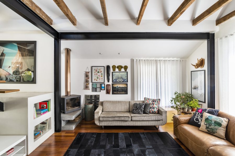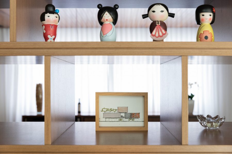 Acima: Sala integrada com mobiliário minimalista e estante sob medida para expor peças afetivas. Abaixo, a coleção dos moradores ganha destaque e se integra de maneira orgânica ao décor. Projeto de Mauricio Melara - Foto: Celso Pilatti (projeto publicado na edição 95 da Revista Casa Sul)