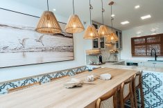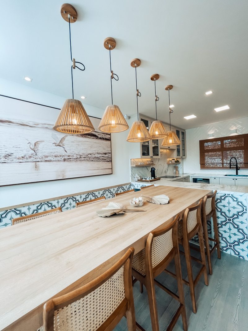Acima: A iluminação da sala de jantar é proporcionada por pendentes de luz de aspecto acolhedor. A cozinha integrada tem lâmpadas frias embutidas no teto. Projeto de Elis Hornig - foto: Ana Vanin (projeto capa da Revista Casa Sul 104)
