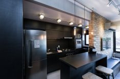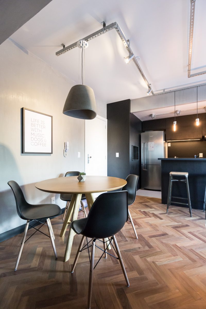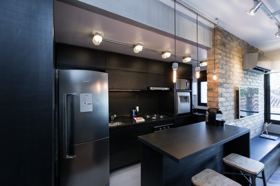 Cores neutras, como cinza e o preto compõem junto com texturas de madeira e concreto. Para as luminárias, perfilados metálicos galvanizados e spots cênicos, além de tartarugas metálicas e pendentes em concreto.