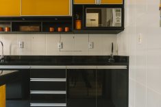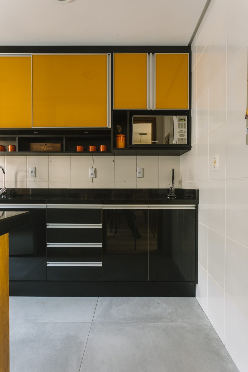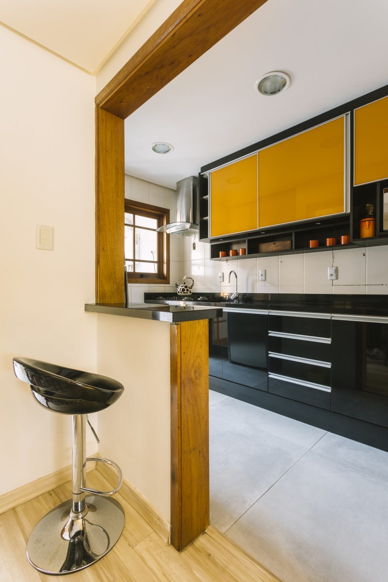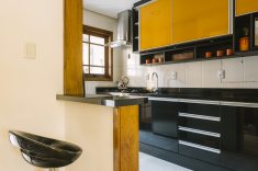 Ambiente pequeno não precisa ser todo branco. Essa cozinha ganhou estilo cool para um jovem casal. O laranja e o preto conversam, conferindo personalidade ao ambiente. “A coifa ganha destaque na decor. “Como são duas pessoas optamos pela mesa americana reduzida, assim o espaço para transitar fica amplo; conclui Paula”.