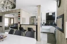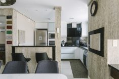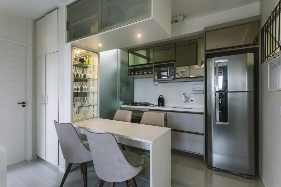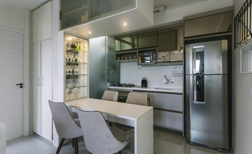 O ideal é ter uma comunicação visual com a sala, que traga um ar de continuidade ao ambiente. Os materiais usados precisam conversar, através de cores, estilos ou texturas. “Esse espaço remete bem a ideia de integração, sofá e cadeiras na mesma cor e paredes com o mesmo padrão. O espelho usado no armário deixa o ambiente com amplitude, finaliza Ascoleze.”