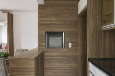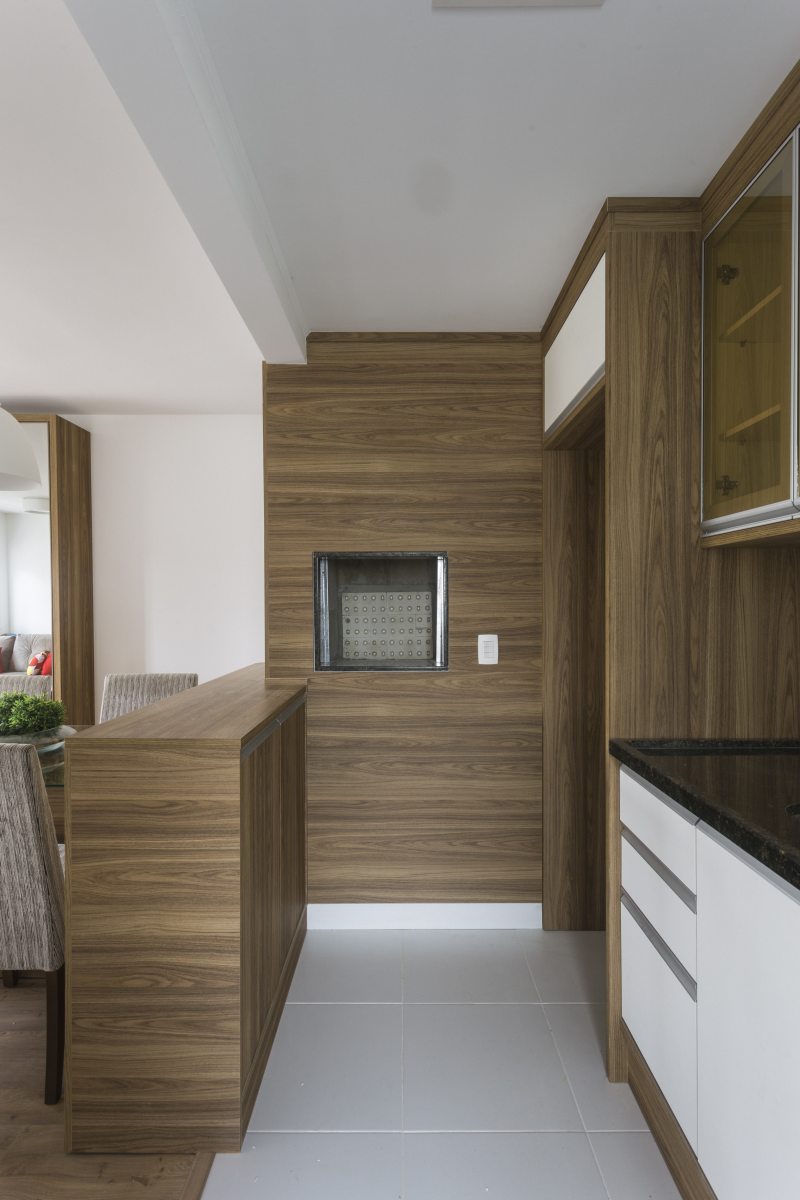 Ambiente moderno e funcional com design que se une em uma atmosfera urbana e prática. A churrasqueira é tapada pela chapa de MDF e toda a combinação fica na cor terrosa. As refeições rápidas podem ser feitas na bancada e para receber os amigos o projeto conta com uma mesa de vidro.