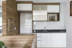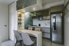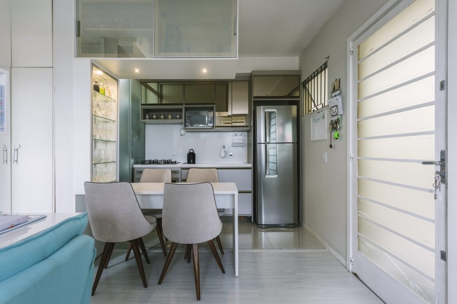 Os móveis planejados com nichos e móveis embutidos resolveram a questão da área reduzida. A mesa entre a sala e a cozinha dá a sensação de amplitude, um armário estreito em cima, que não ocupa tanto espaço, permite guardar mais objetos. A área social para as crianças brincarem ganha espaço.