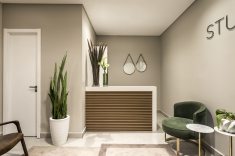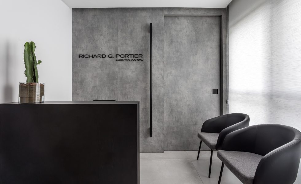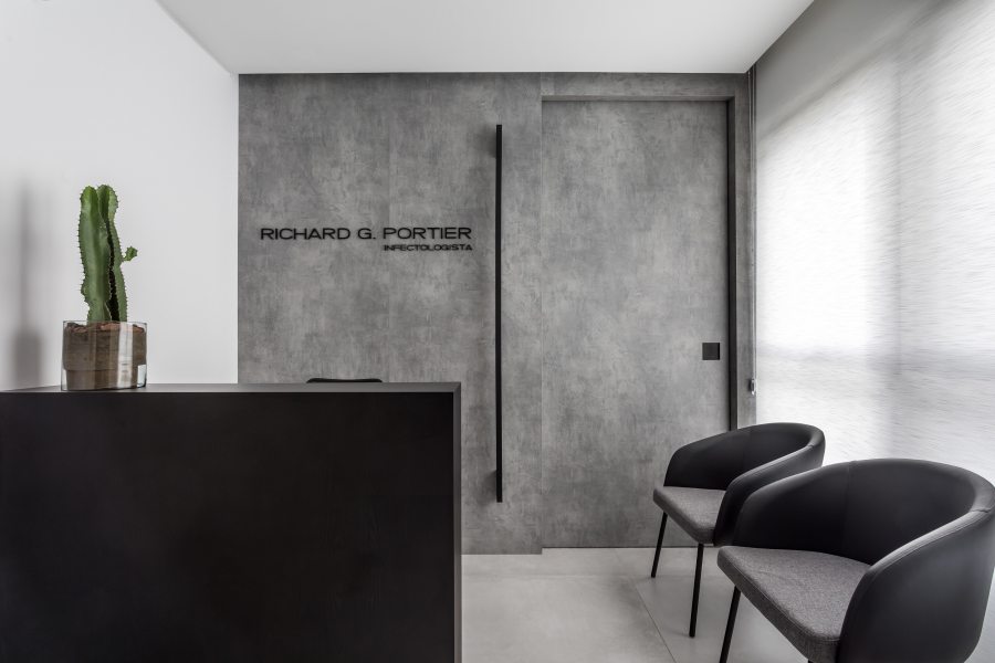 Na recepção deste consultório médico, o cimento queimado é o grande protagonista. A composição com o preto e o branco garante a sobriedade do local. O design simples e anguloso reafirma o estilo minimalista atemporal explorado pelas arquitetas Carolina Danylczuk e Lisa Zimmerlin, da UNIC Arquitetura. Na escolha do décor, o princípio de usar apenas o essencial prevalece com um único ponto de cor, representado pelo cacto disposto sob o balcão.