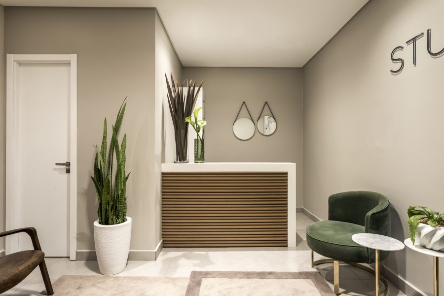 A arquiteta Amanda Mello propôs um espaço aconchegante que não fosse cansativo aos pacientes da clínica. Um visual mais clean e sem excessos auxilia nessa missão, juntamente com os móveis soltos da M. Decor, que garantem conforto na hora da espera. A base em tons neutros permite um jogo de cores nos detalhes, trazendo vida ao ambiente. O ripado de madeira e emolduramento em madeira branca criam um contraste e são destaques.