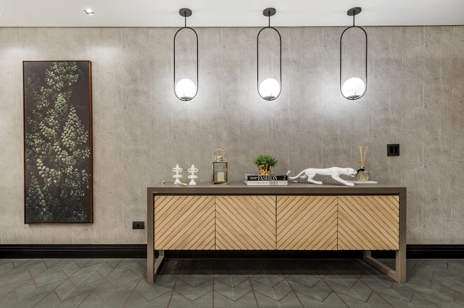 Neste projeto, assinado pela arquiteta Bruna Souza e a designer Emanuella Leite, do BE.Studio, o minimalismo prevalece no formato reto do mobiliário, que conversa com a obra de arte também retilínea. Além disso, a escolha dos tons neutros do papel de parede, disponível na StilHaus, e do revestimento no piso também ajudam a reforçar o estilo.