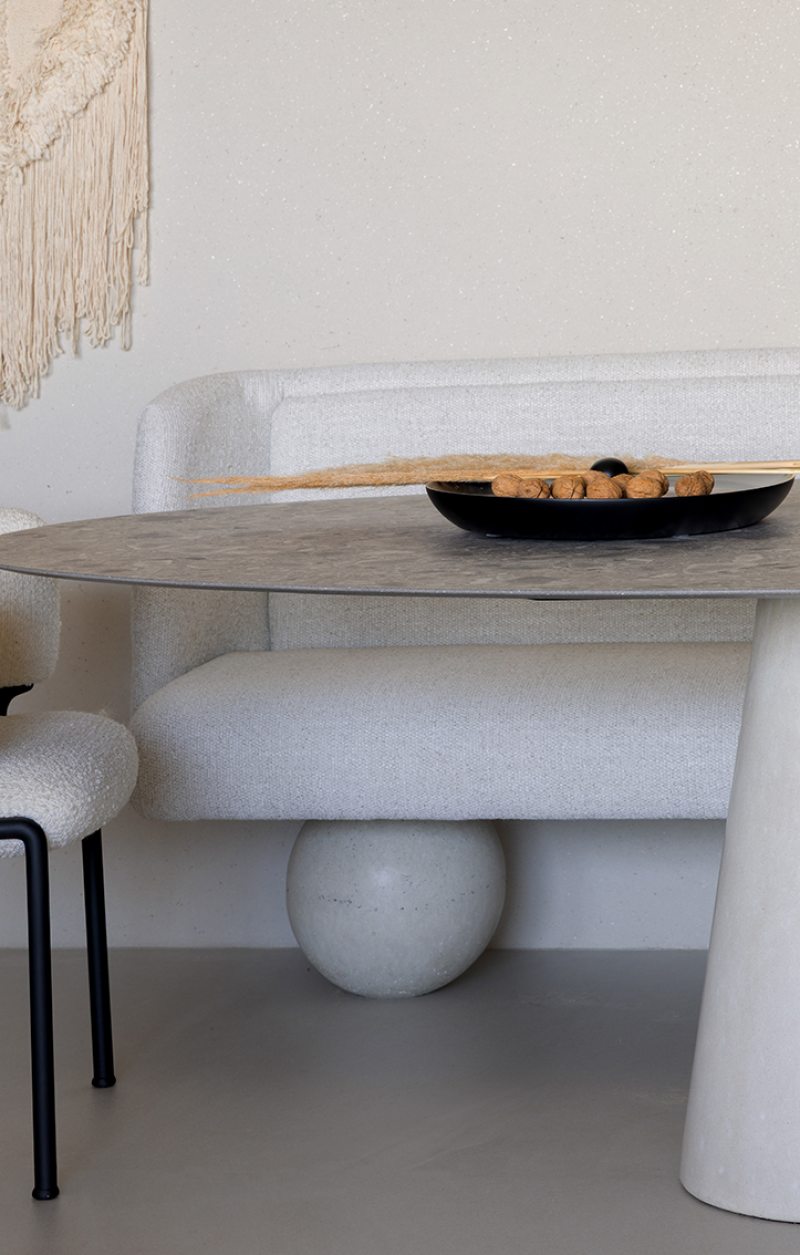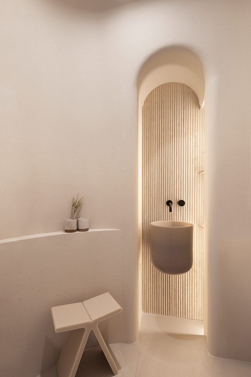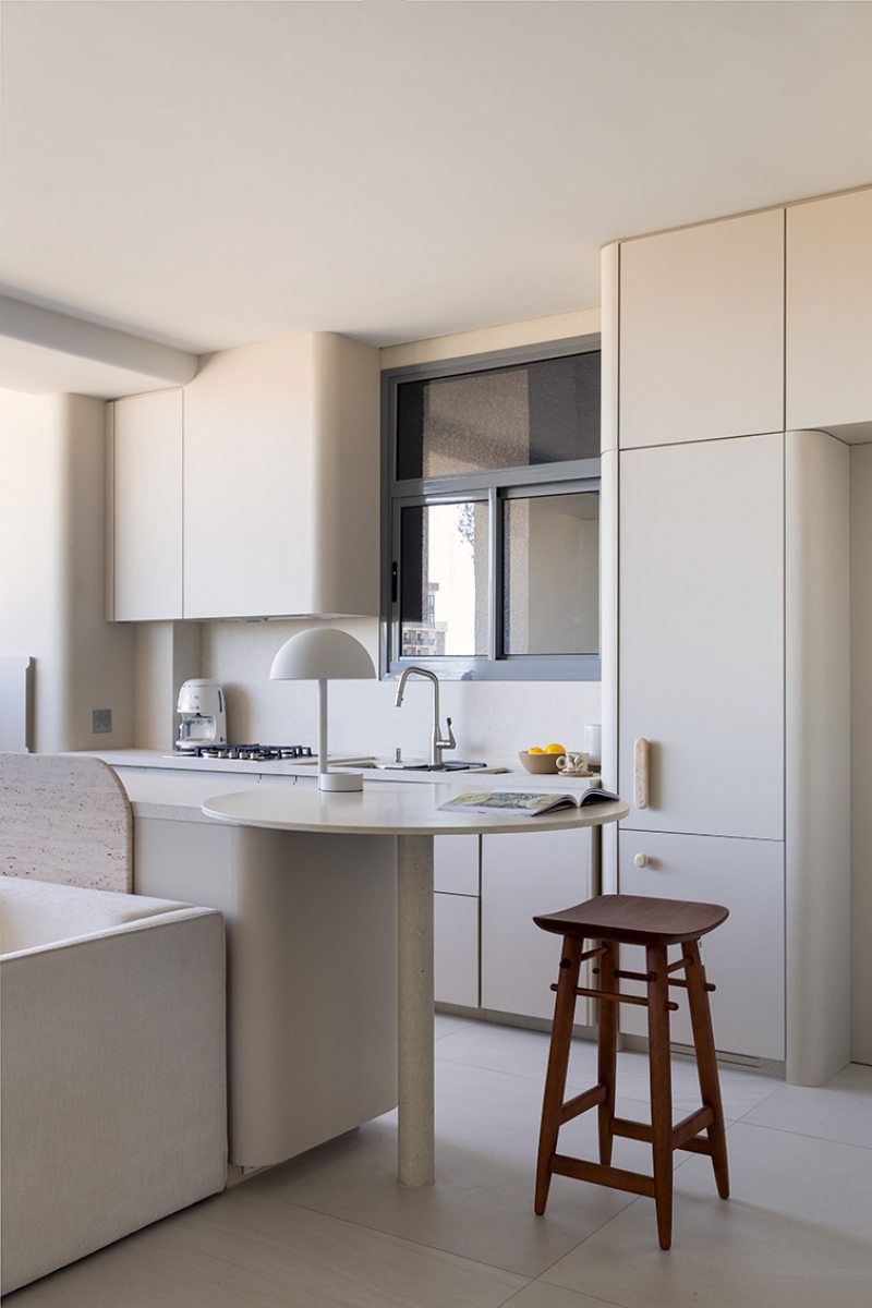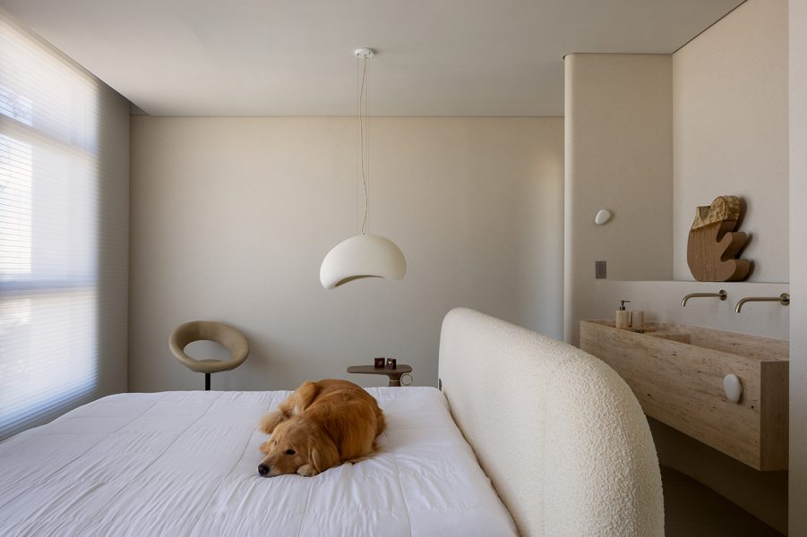 Relevos verticais, superfícies levemente granuladas, tecidos encorpados, pedra natural e madeira clara criam variações sutis que enriquecem o espaço sem romper a unidade visual. A arquitetura está baseada na continuidade e na percepção sensorial dos materiais para dar profundidade aos ambientes. A proposta se organiza em torno de uma paleta quase contínua de tons claros — beges, off-whites e superfícies minerais que parecem pertencer à mesma família cromática.