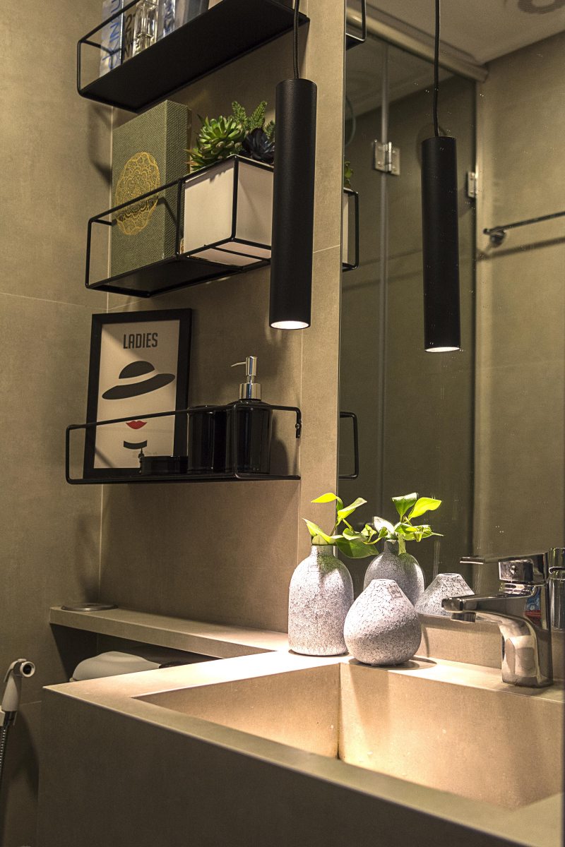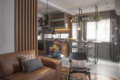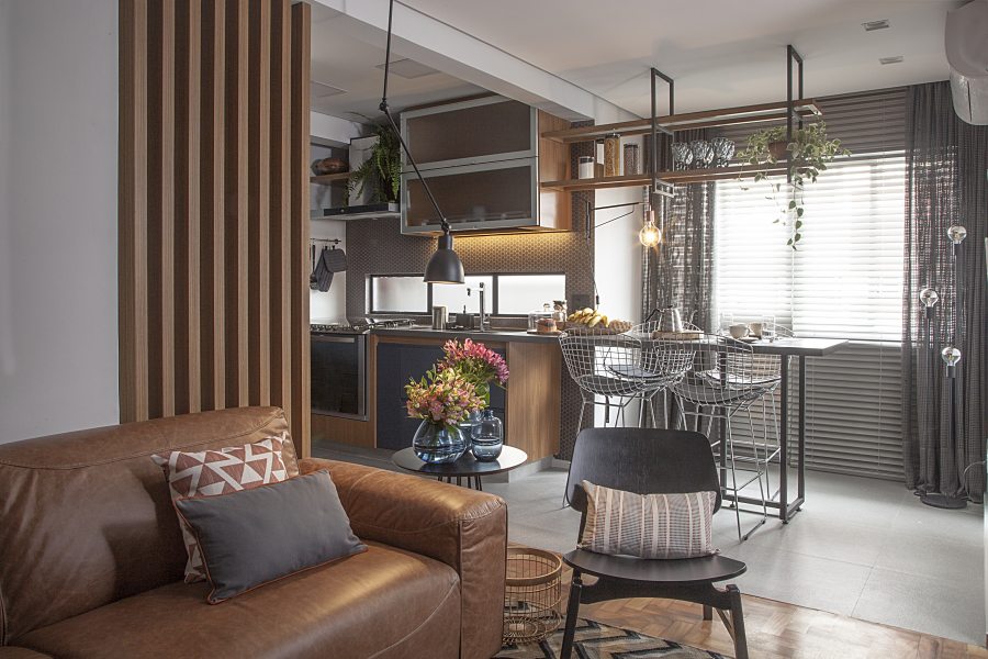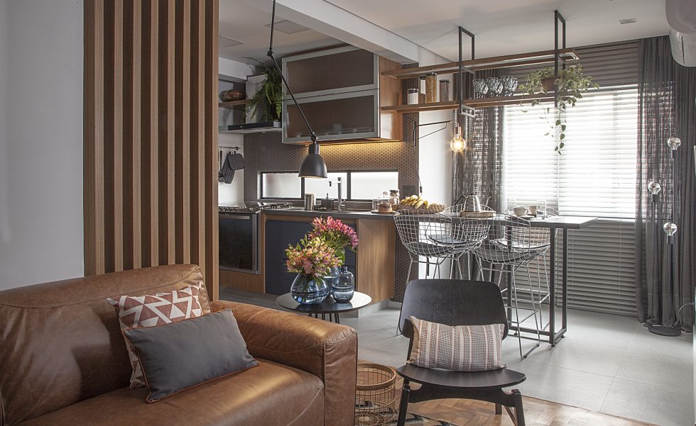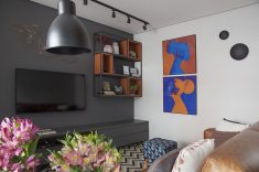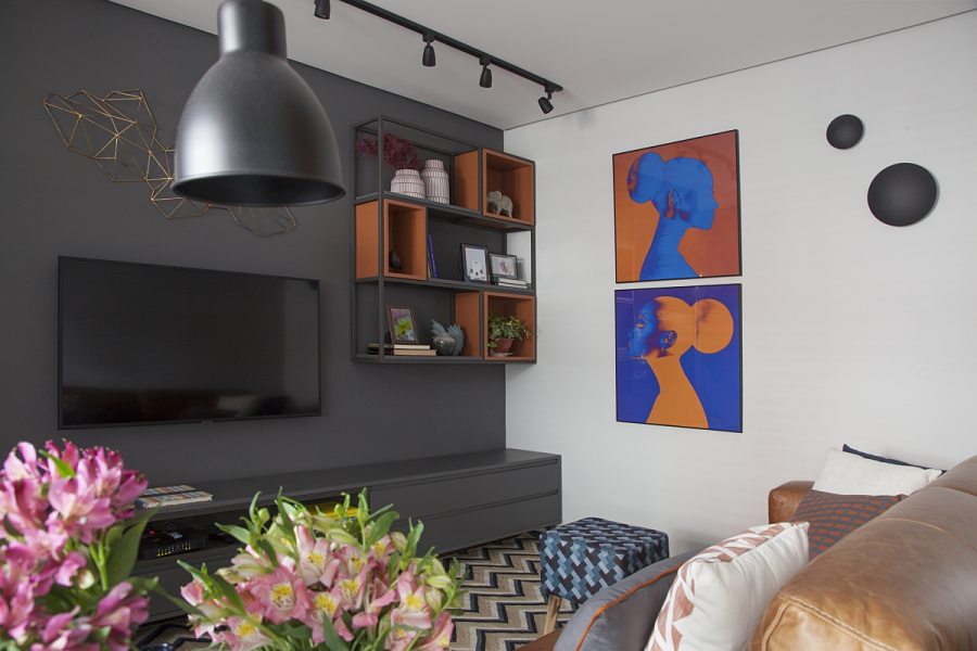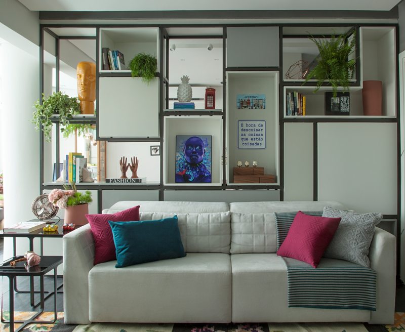 É inegável o sucesso que os nichos propiciam no décor. No apartamento com apenas 34m², os profissionais agregaram os tamanhos diferenciados das peças em uma belíssima estrutura de serralheria. Dentro da pequena área disponível, Renato e Erika lançaram mão do espaço aéreo, em cima do sofá, para trazer um clima cool ao projeto. Luminárias, livros, objetos decorativos e plantas demarcaram a proposta para a sala de estar do morador.