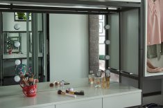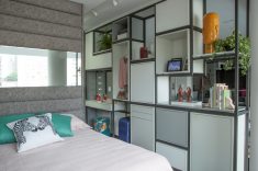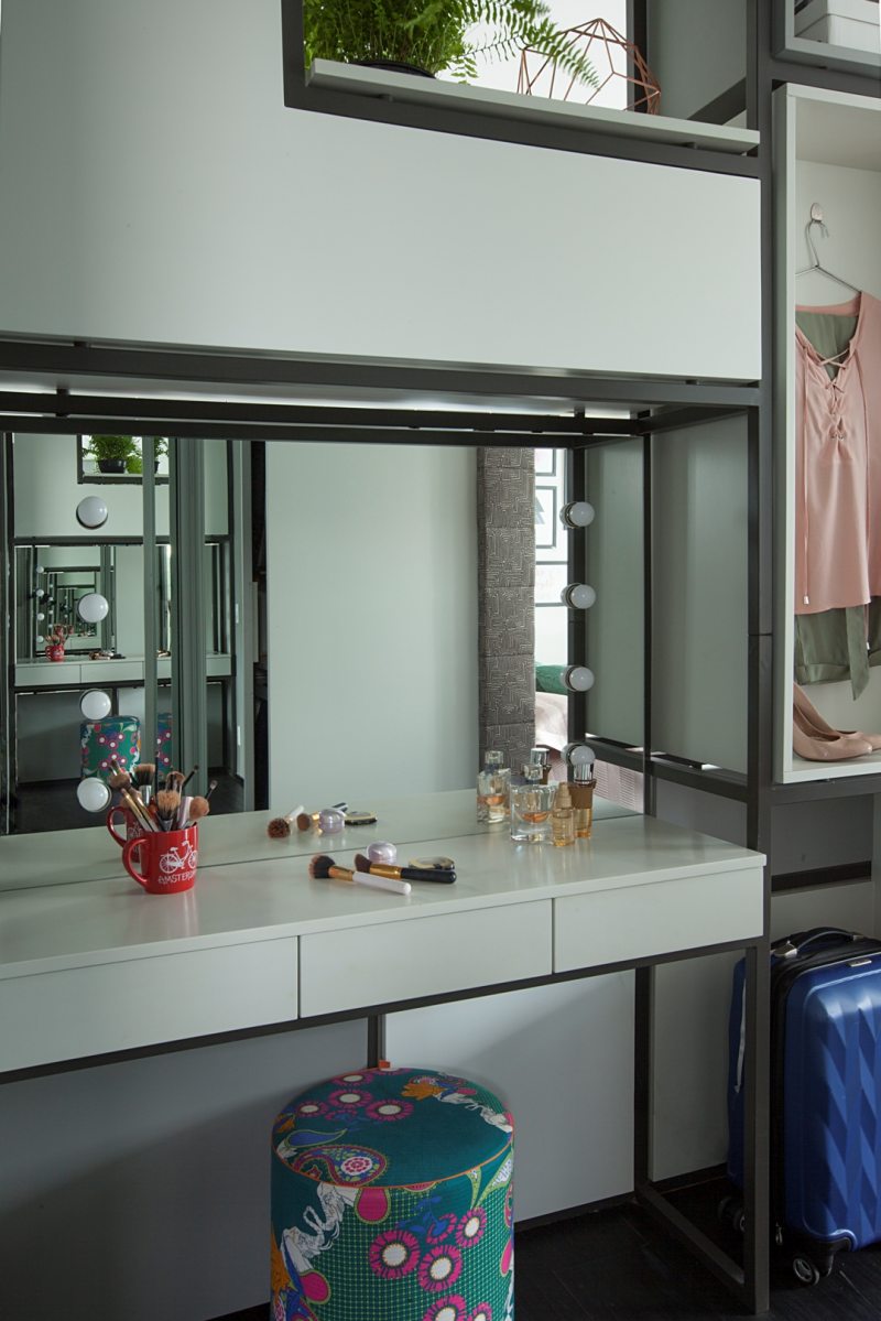 Como dividir os ambientes em áreas pequenas e ainda conciliar funções? Nesse apartamento o desafio estava em estabelecer a sala de estar e deixar mais restrito o quarto da moradora. Assim, a serralheria foi solução encontrada pelos arquitetos do escritório. Com a estrutura que abrange a altura entre o piso e o teto, novamente os nichos são excelentes por sua multifuncionalidade na decoração. Quem está na sala enxerga a ambientação trazida à ala social, enquanto gavetas, armários, vãos para adornos e até mesmo a penteadeira com ares de camarim integram o "verso" do móvel voltado para o quarto da moradora.