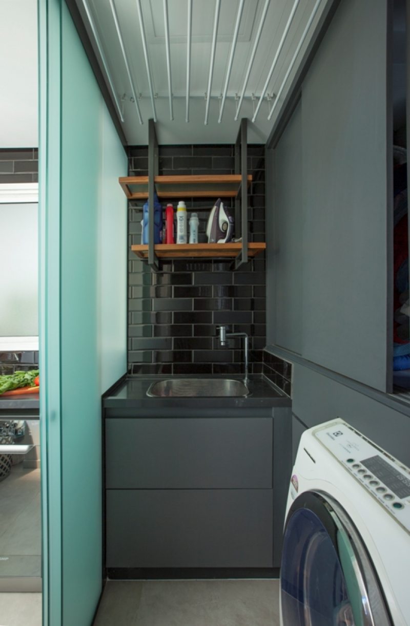 Na estreita área de serviço do apartamento, a aposta de Renato e Erika foi compor a estrutura em serralheria e madeira para organizar os produtos de limpeza mais utilizados no dia a dia. Somada ao revestimento no estilo subway tile e a marcenaria em tom de cinza, garantiu um visual urbano ao ambiente.