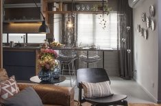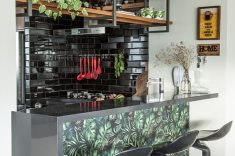 Nessa proposta de cozinha com bancada que ‘separa’ a cozinha da sala de estar, mais uma vez a serralharia sustenta as prateleiras de madeira que percorrem toda o perímetro do vão. Junto com a função de decorar, novamente a união dos materiais entraram em cena para guardar os itens de cozinha manuseados pelos moradores. O preto, que marca a pintura da serralharia, tem tudo a ver com os demais elementos que integram o projeto.