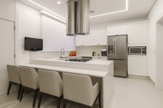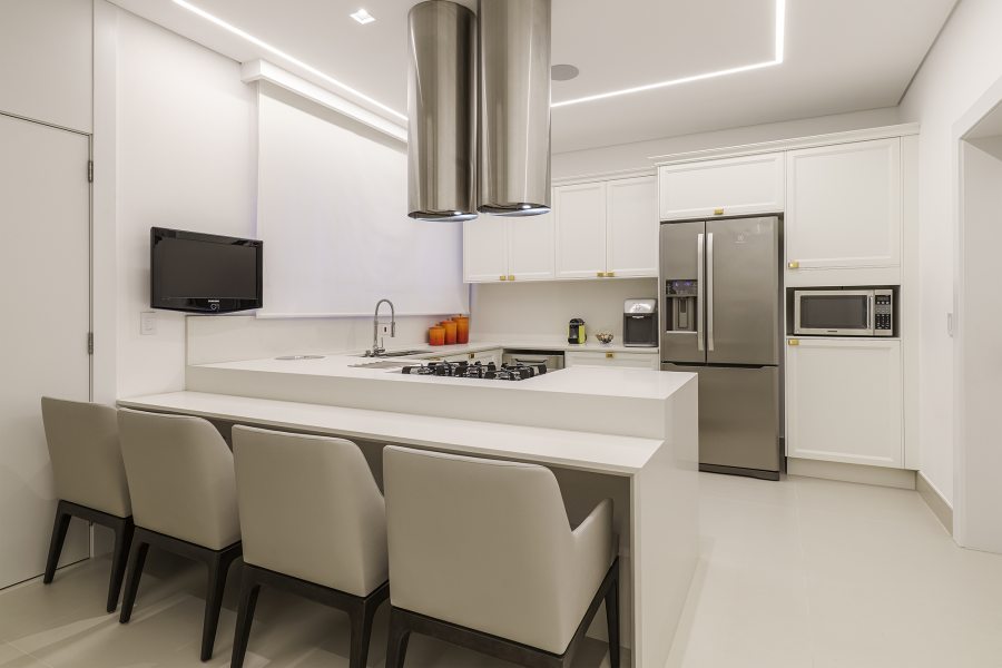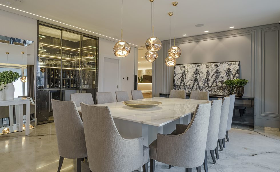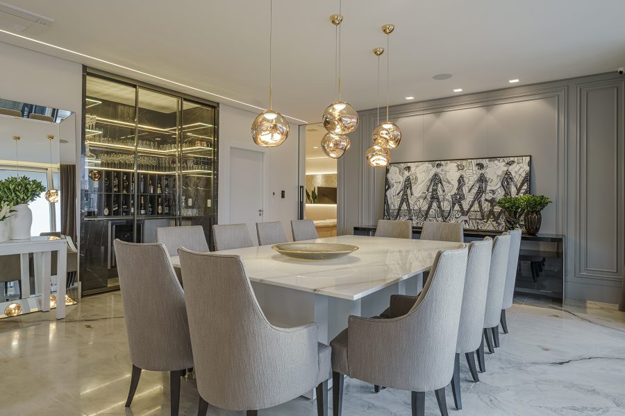 “A riqueza de detalhes se estende ao mobiliário pensado para atender ao lifestyle dos moradores, que priorizam conforto e bem-estar. Para tanto, a escolha pelo design e de alto acabamento da Florense Carlos de Carvalho foi fundamental para o resultado final dos ambientes”, relata a arquiteta. Os principais destaques dos móveis estão na cozinha, desenhada com portas inspiradas nos bistrôs franceses da década de 1940 e com acabamento em microtextura Branca e puxadores Dijon, e na adega, que integra a sala e conta com os acabamentos Santa fé e Microtextura Frost e portas em vidro incolor."