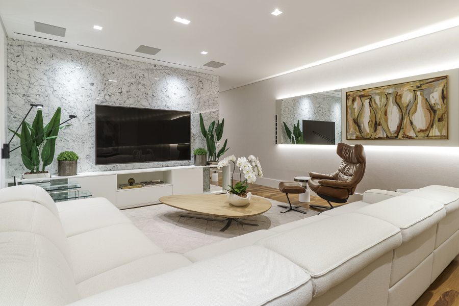 O living social recebe uma iluminação natural, graças as grandes janelas, e integram a um espaço gourmet na sacada, com uma visão privilegiada da cidade. “Em todo o projeto é possível observar um olhar para os elementos naturais, como o mármore, madeira e plantas. Além de uma bela vista da cidade de Curitiba com grandes janelas, que quando abertas, revelam a charmosa varanda com espaço gourmet, trazendo frescor e preenchendo de luz natural todos os cômodos da casa”, descreve Samara. No hall de entrada, o espaço recebe o Ripado Laminado BP Grafite e iluminação, da Florense, que promovem aconchego ao acessar o apartamento.