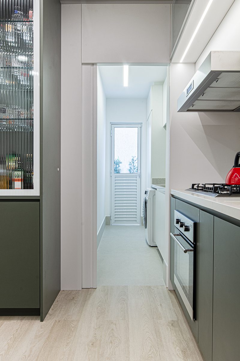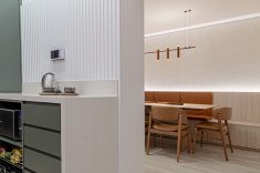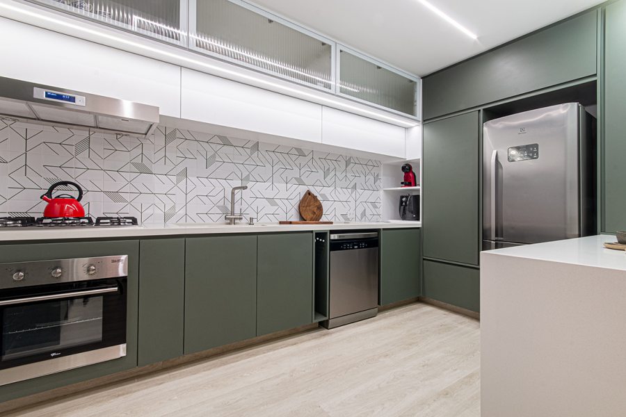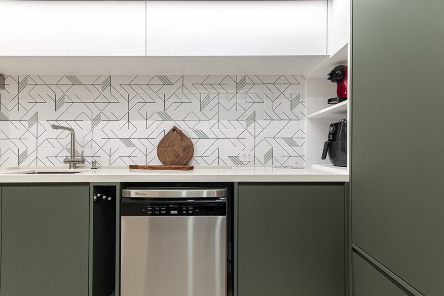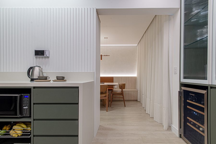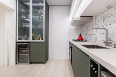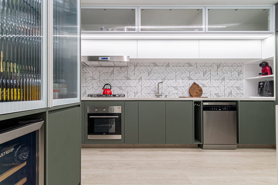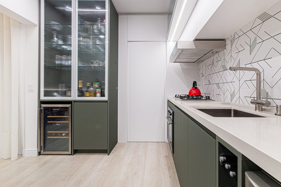 Os azulejos geométricos assinados pelo artista Rômulo Lass resultaram em uma interessante composição com as portas de vidro canelado e com as bancadas de quartzo off-white. A cristaleira, com bar e adega climatizada, atendeu à necessidade dos moradores apaixonados por bons vinhos, finalizando o projeto com um toque extra de personalidade.