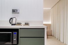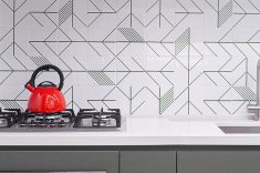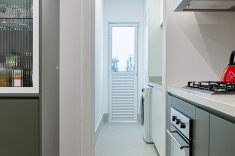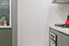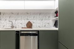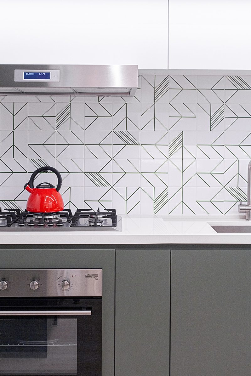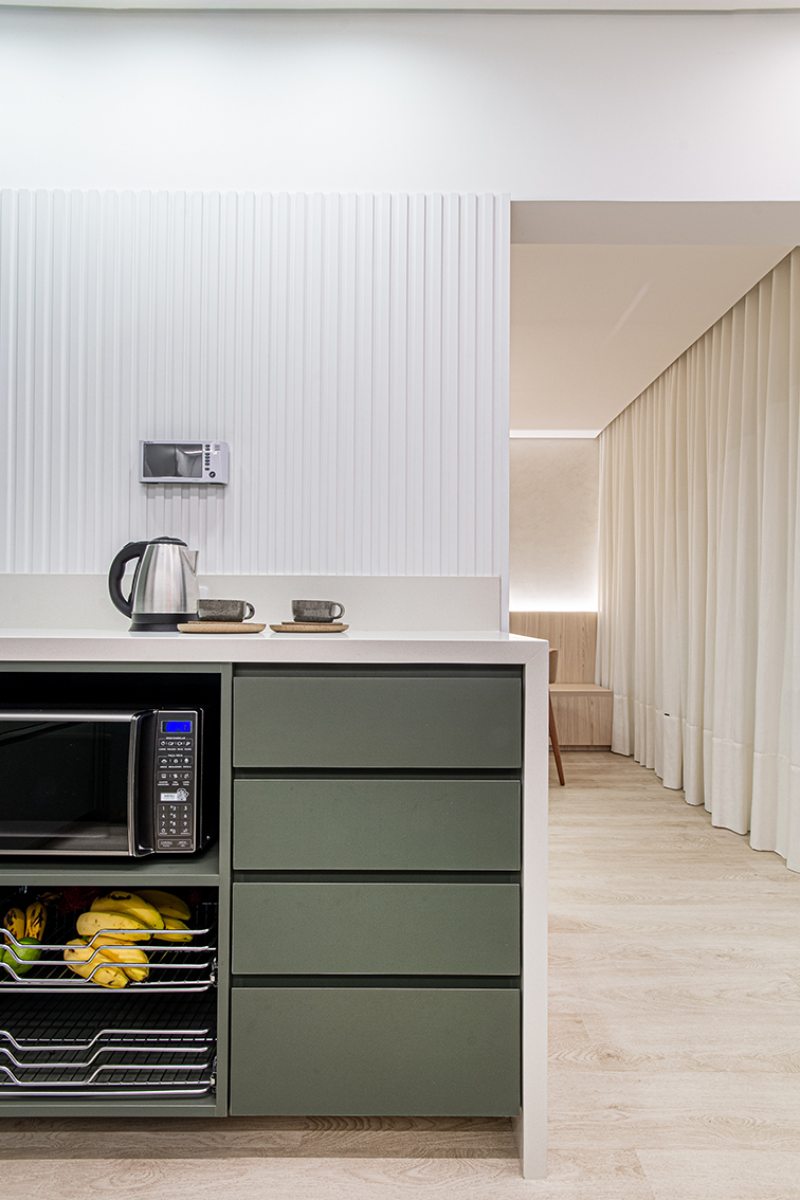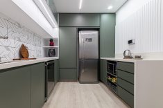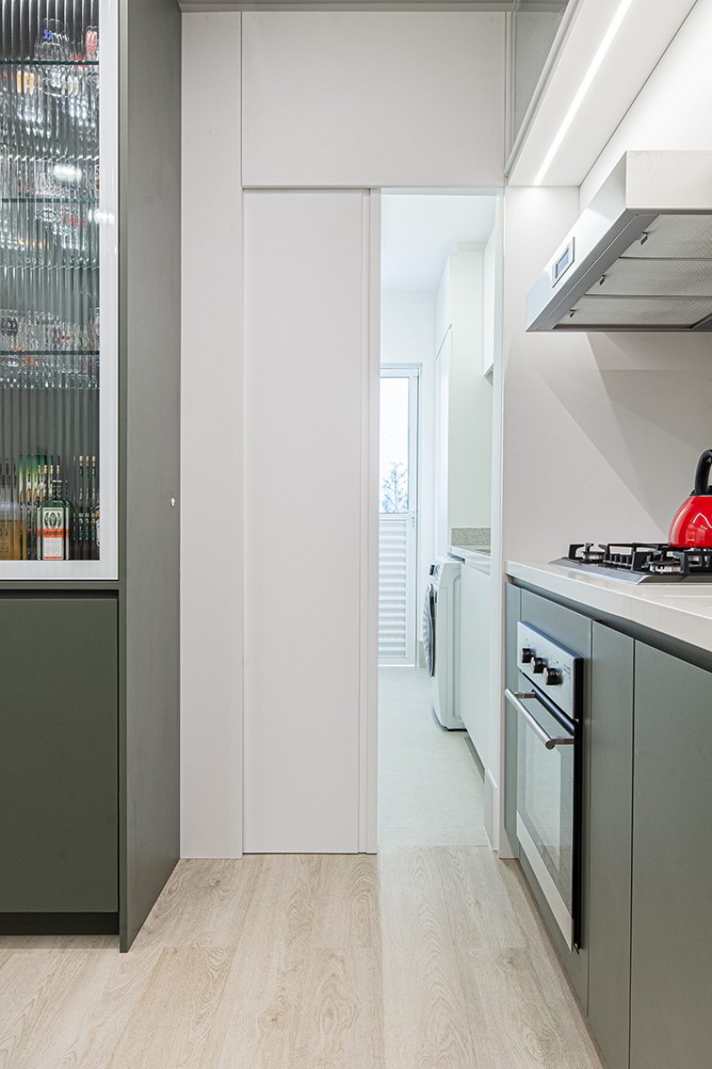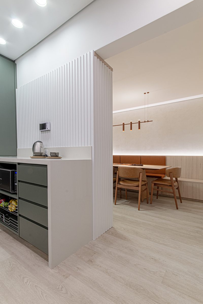 Os azulejos geométricos assinados pelo artista Rômulo Lass resultaram em uma interessante composição com as portas de vidro canelado e com as bancadas de quartzo off-white. A cristaleira, com bar e adega climatizada, atendeu à necessidade dos moradores apaixonados por bons vinhos, finalizando o projeto com um toque extra de personalidade.
