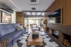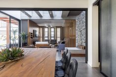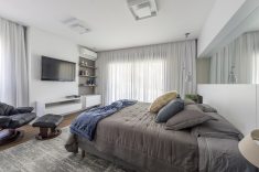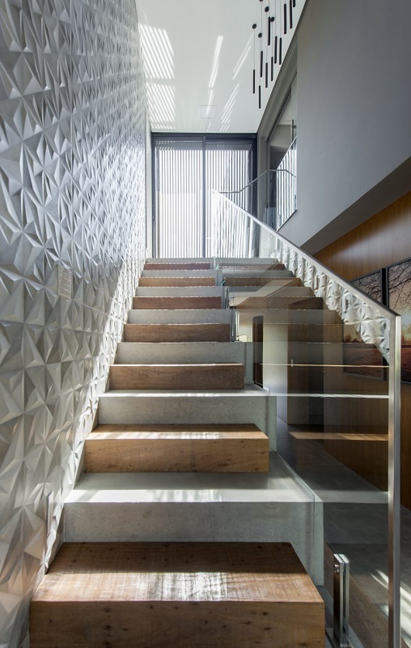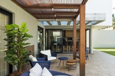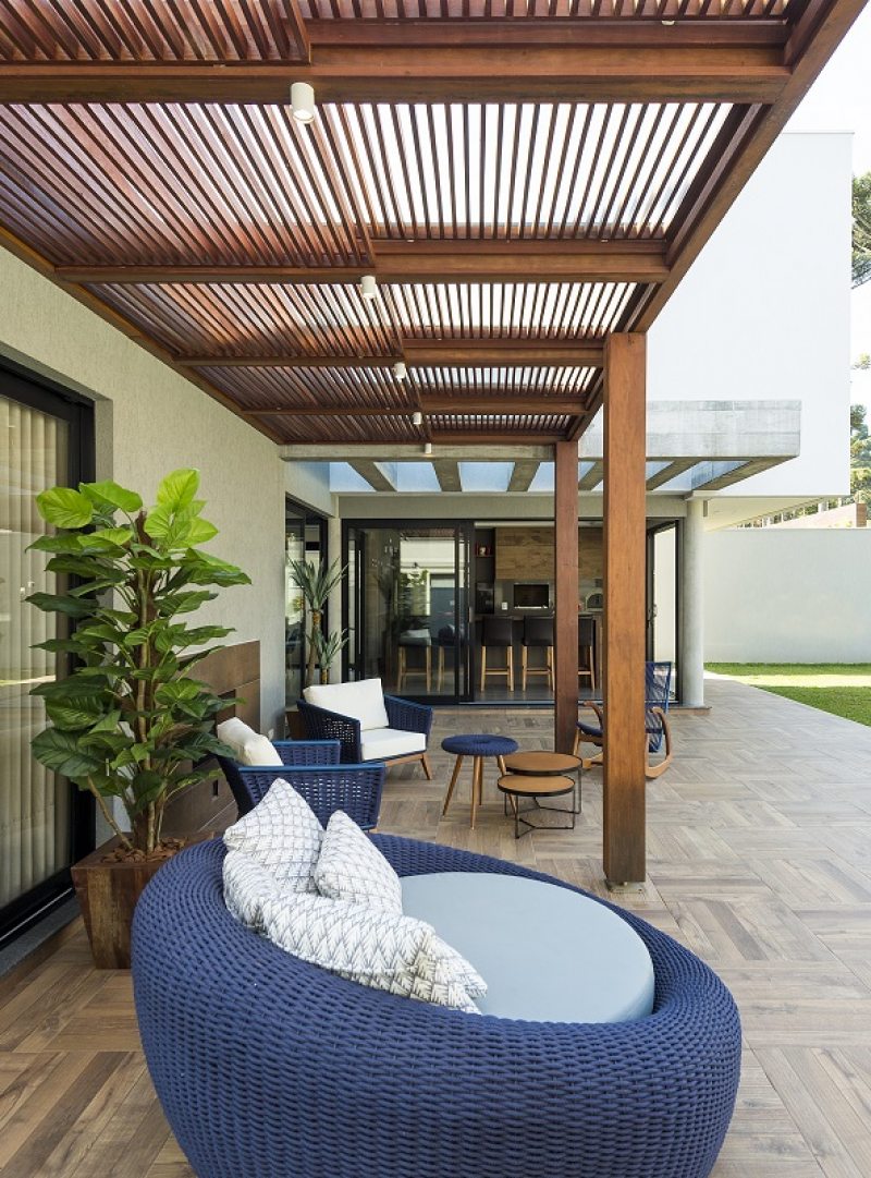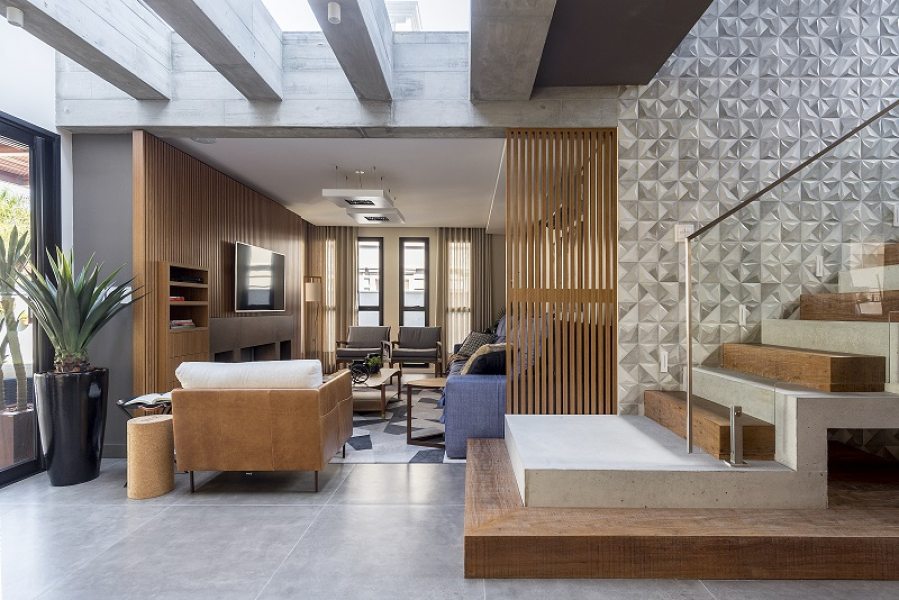 Marcada pela integração e pelo contraste entre elementos, a casa de alvenaria possui estrutura de concreto e grandes entradas de iluminação natural. Ao todo são 21 ambientes, em dois andares e um subsolo, nos quais a madeira oferece aconchego e rusticidade. Destaque para a escada com degraus intercalados em madeira e concreto. A paixão do proprietário por marcenaria também transparece na bancada do espaço gourmet, na mesa da sala de jantar, e no pergolado.