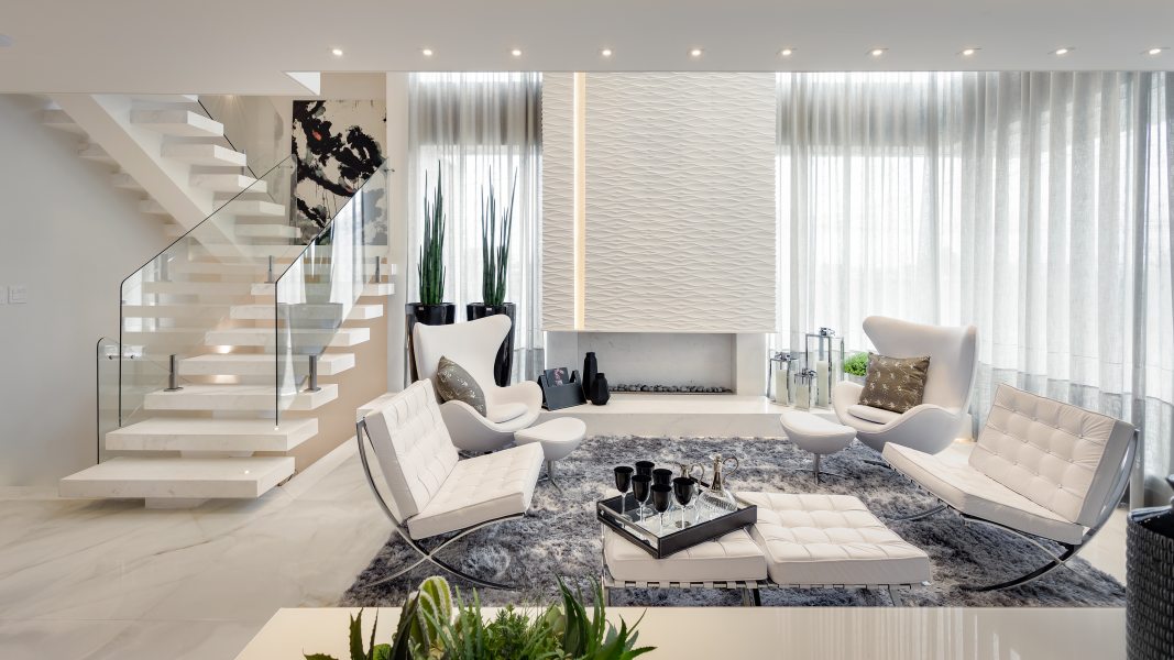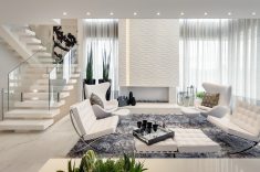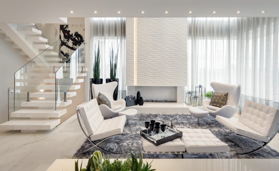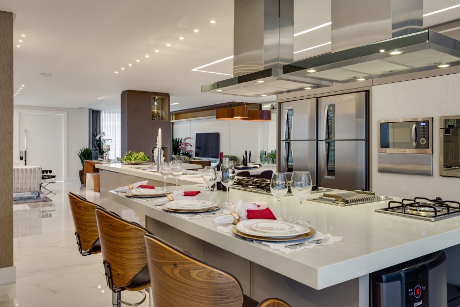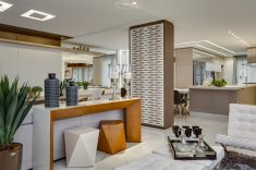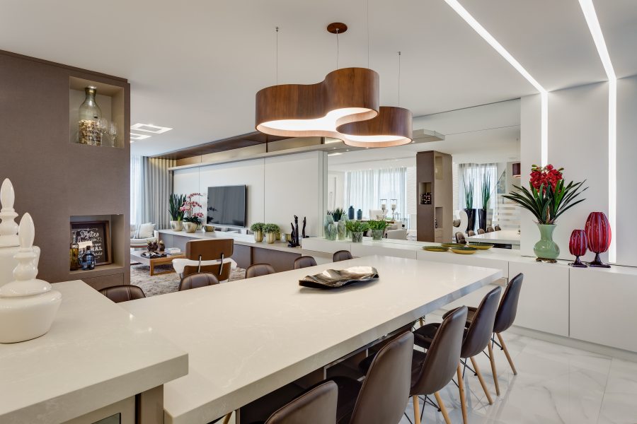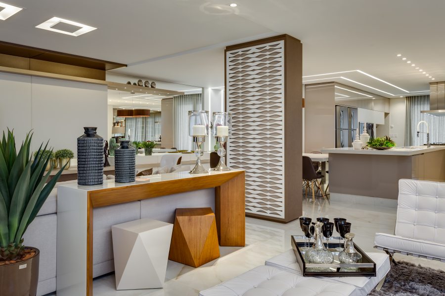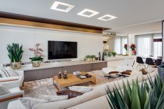 Compondo com clássicos do design, todo o mobiliário foi desenhado por Machado, Weiss e Moraes e executado em marcenaria. Destaque para o piso aquecido, as cortinas automatizadas, o projeto luminotécnico totalmente em LED e a lareira, que ganha destaque com o revestimento de placas de gesso 3D.