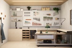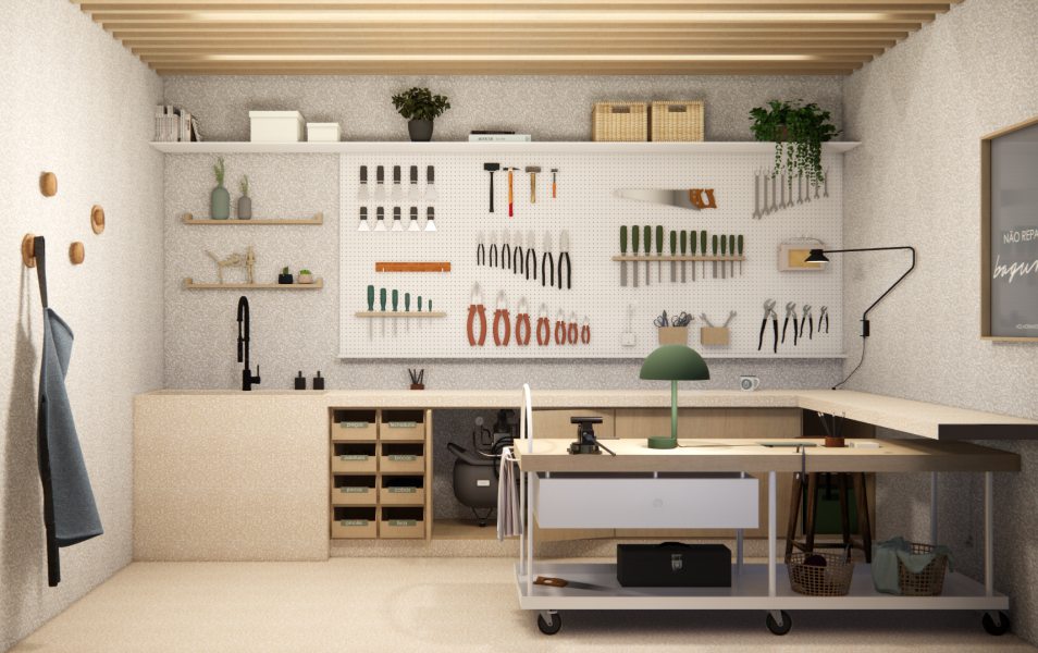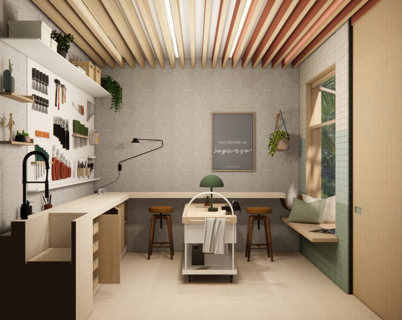 No interior, a bancada é de granilite amarelo, dentro da paleta natural, mas com um toque de cor, e tem uma pia esculpida. Na parede principal, um grande painel branco de mdf perfurado serve como armazenamento organizado das ferramentas e também de decoração. No centro, um carrinho-ilha que pode ser levado às áreas externas, usado como apoio para trabalhos manuais, jardinagem e quaisquer outros momentos criativos.