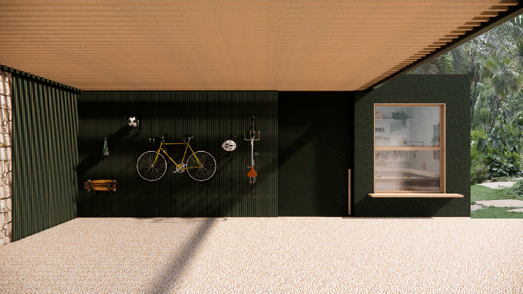 A janela articulada se abre completamente e se transforma em banco, área de espera ou para contemplar o exterior. O bicicletário de ripas de madeira articuladas permite flexibilidade: pode ser para bicicletas, itens esportivos ou decorativos, e toma conta da parede externa, finalizando o espaço. Para ver mais projetos acesse: https://somosjuntos.com.br/se-mostram/