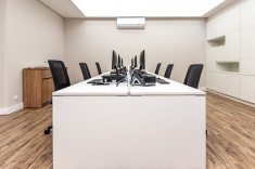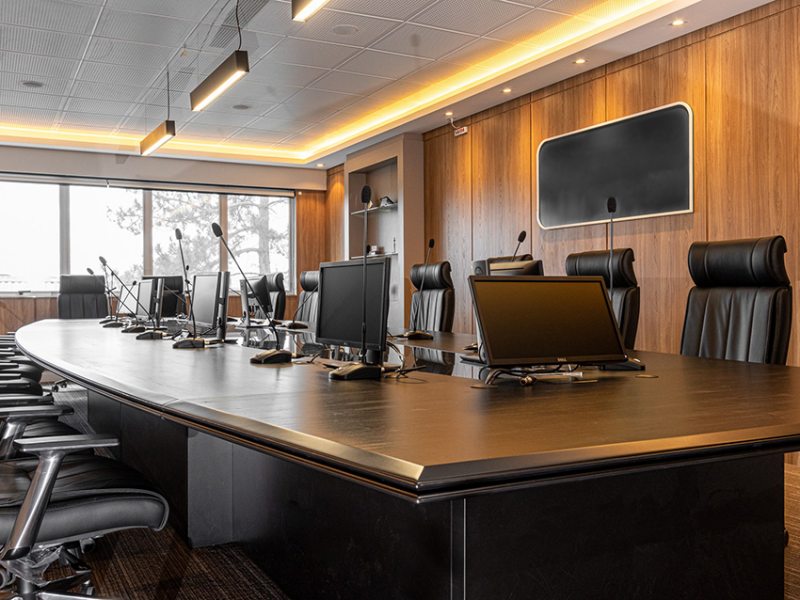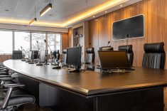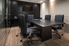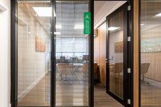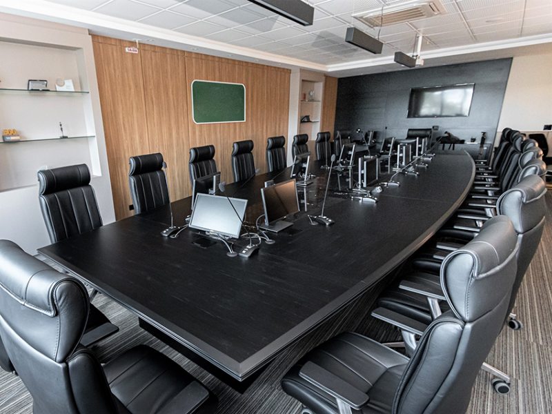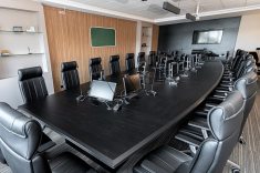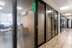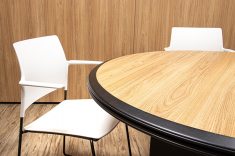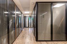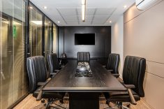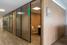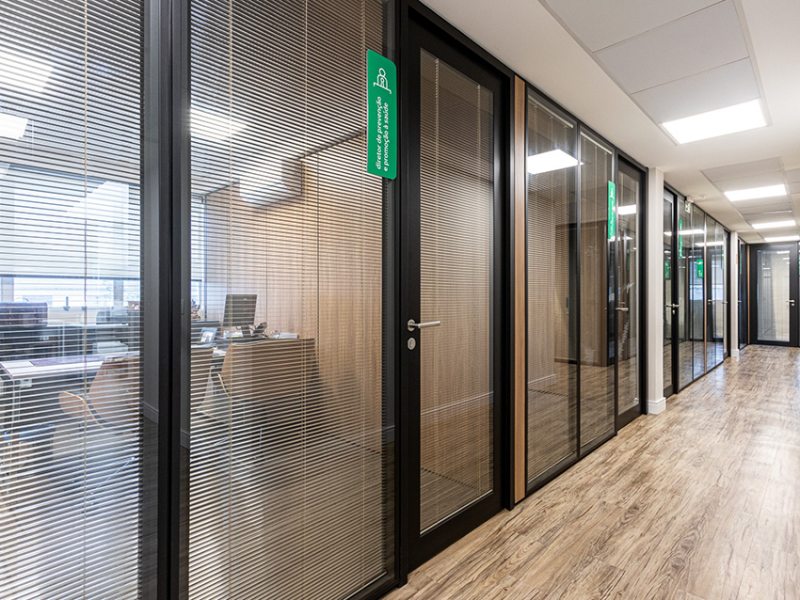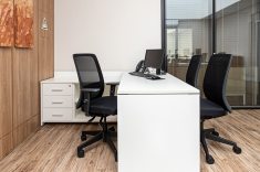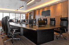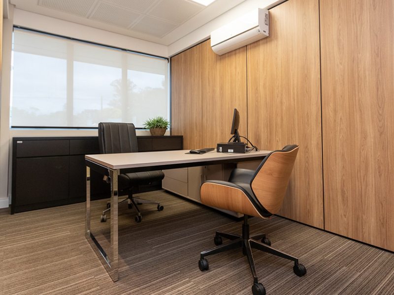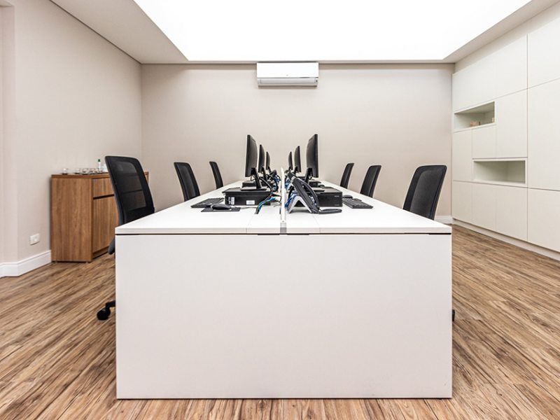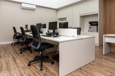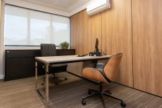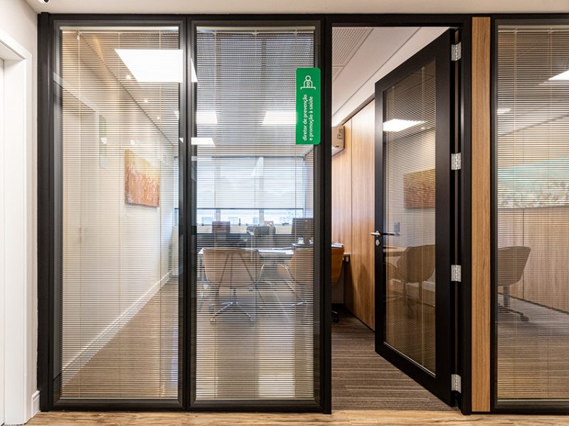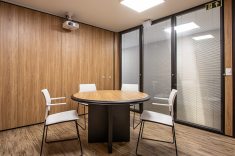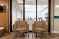 O uso de divisórias piso-teto com vidro duplo com persianas internas e madeirado nos painéis fechados valoriza ainda mais cada espaço, mobiliado com mesas diretivas em L, plataformas de trabalho e mesas de reuniões marcantes e imponentes. Mesmo com acabamentos e produtos distintos em cada ambiente, há uma coerência visual que harmoniza e caracteriza o projeto do escritório Cosmopolita Arquitetura. Os produtos levam a assinatura da Squadro em destaque em mais um case de sucesso.