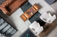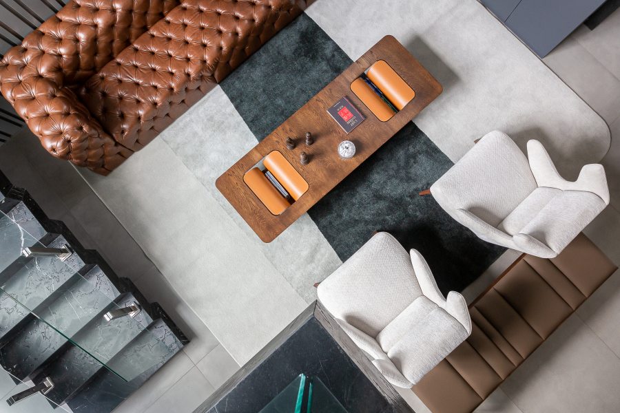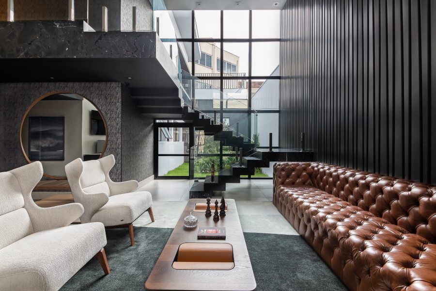 O primeiro passo para atender ao pedido dos clientes foi revitalizar a fachada e o muro do imóvel segundo uma estética moderna, marcada por volumetria geométrica e grandes vidraças espelhadas. Os interiores, por sua vez, foram decorados com mobiliário moderno da M. Decor para equilibrar a imponência clássica dos revestimentos de mármore e da paleta de cores neutra. “O mobiliário da M Decor atendeu exatamente à proposta do projeto, que era a de criar um diálogo entre o clássico e moderno. As poltronas de tecido boucle, por exemplo lembram o antigo por meio do tecido mas equilibram o design com detalhes como os pés modernos.” – elogiou a arquiteta.