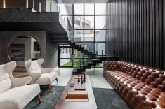 O paisagismo exuberante e a esquadria do piso ao teto trouxeram luminosidade e leveza ao saguão com pé-direito duplo, decorado com um sofá de couro caramelo e mesa baixa com revisteiros embutidos. O ambiente foi pensado para atender não só aos clientes e profissionais, mas também aos frequentadores dos cursos e palestras oferecidos no local. No andar superior, por fim, o décor das salas dos advogados combina madeira e tecidos naturais a iluminação moderna e fotografias em preto e branco. Neste escritório o bem-estar é lei.