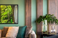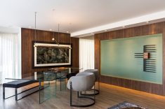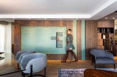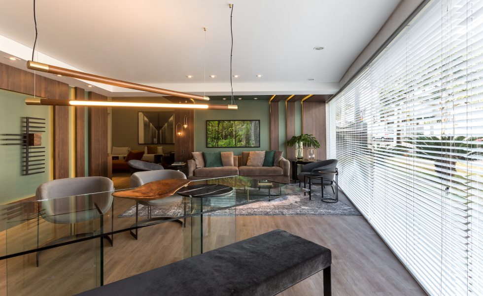 A composição do verde, representado pelo padrão Amazônia, e do madeirado mais sóbrio, presente no padrão Imbuia, agregam personalidade ao espaço e ressaltam a proposta. O design também é protagonista, evidenciado pelo mobiliário contemporâneo, que une peças tanto de linhas retas quanto mais curvilíneas. Destaque para as obras fotográficas de Marcelo Krause e para escultura “Pente”, de Eduardo Custódio.
