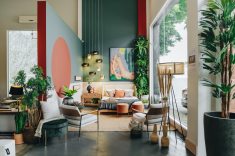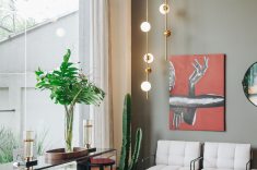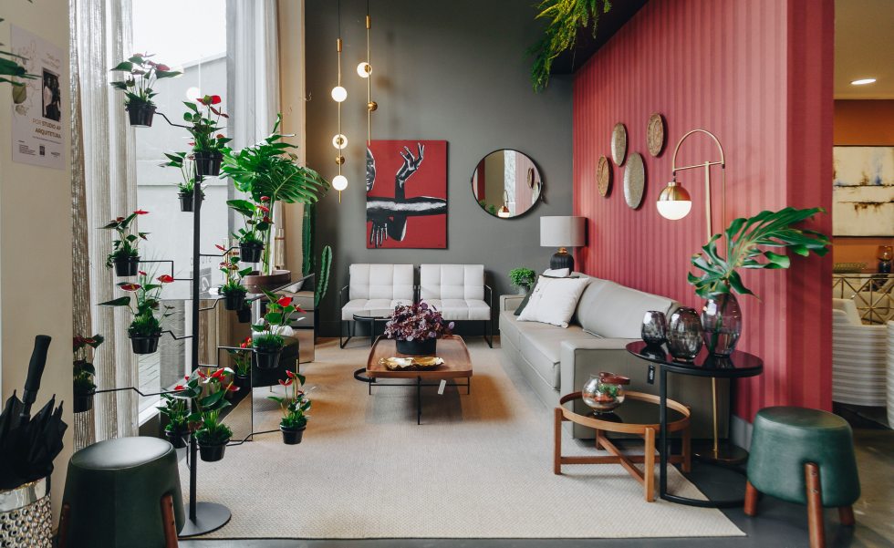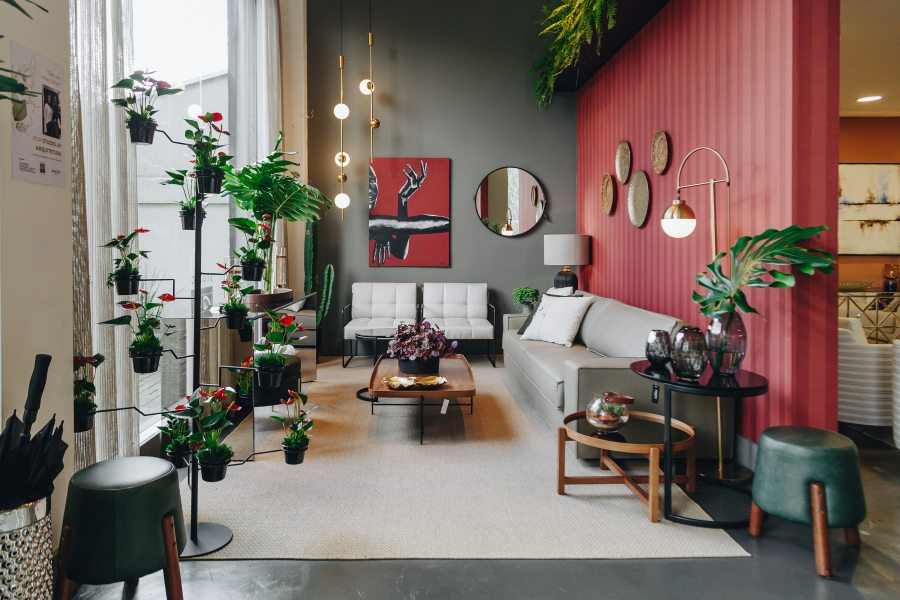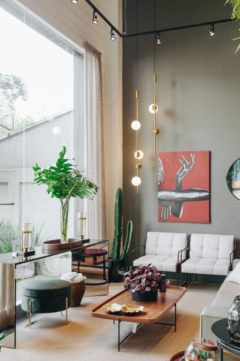 Ambiente de personalidade forte, a vitrine assinada pelo escritório Studio AP Arquitetura conta com uma base neutra em que predomina o cinza para destacar a parede e o quadro de cores vibrantes. As profissionais optaram pelo mobiliário de estilo contemporâneo e linhas retas, da Masotti Curitiba. O conceito biofílico está presente em elementos cruciais do décor através das plantas e texturas das fibras que trazem o aconchego e a conexão com o lar. Além das peças de iluminação, o metal também esta presente nos acabamentos do mobiliário.