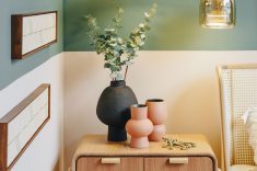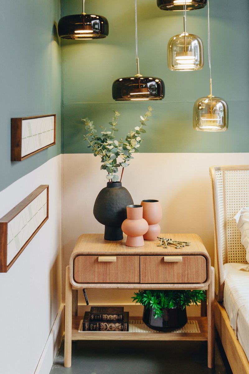 A Vitrine da suíte master oferece uma atmosfera solar no décor, tendo a brasilidade como principal inspiração, as profissionais Patrícia Borba e Lya Marty optaram por cores vibrantes na pintura e diferentes texturas, encontradas na cabeceira e mesa de apoio. O destaque vai para cabeceira da cama, que conta com tramas em palha, proporcionando mais textura e aconchego ao espaço. Os pendentes foram ambientados de uma forma que formassem uma escultura luminotecnica, trazendo mais personalidade e sofisticação ao ambiente.