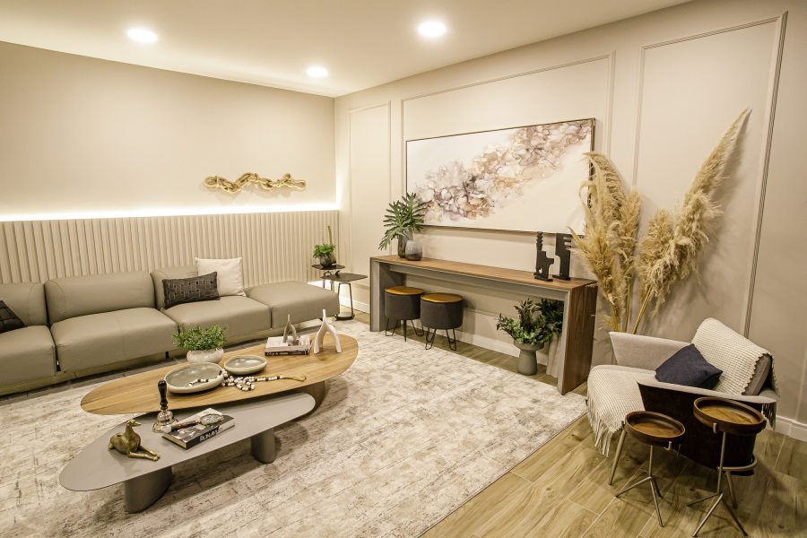 Com a aplicação de uma paleta de cores neutra, com predominância do bege, se cria uma composição harmônica, organizada e atemporal. “As cores em destaque ficam por conta da decoração e mobiliários soltos, que são evidenciados pelo fundo nude, trazendo charme ao ambiente”, comenta Caroline.