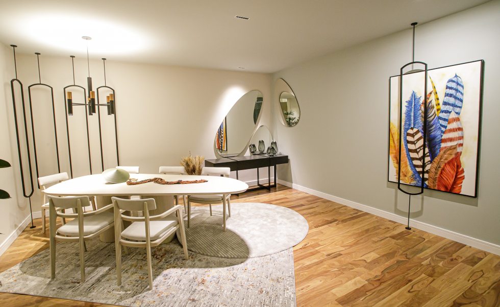 Um dos destaques do living é a mescla de diferentes formas, texturas e materiais, como a madeira e o couro no mobiliário, o vidro nos pendentes, o espelho e os quadros. Os itens se harmonizam por meio de diferentes formas e composições, que se sobrepõe para formar um ambiente agradável e convidativo.